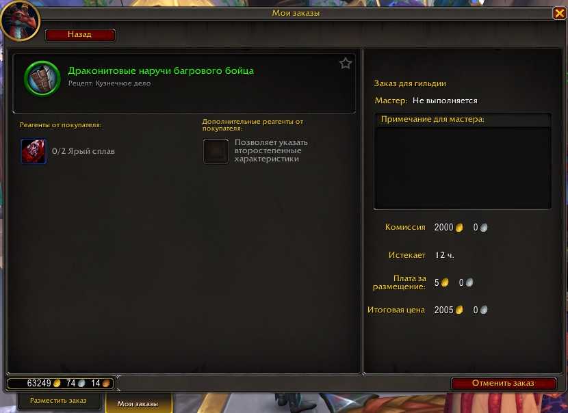 Обратите внимание, что при создании публичного заказа нельзя выбрать качество готового предмета. Это означает, что вашу заявку может взять ремесленник с недостаточным уровнем квалификации, из-за чего вы с большим шансом получите вещь низкого ранга качества