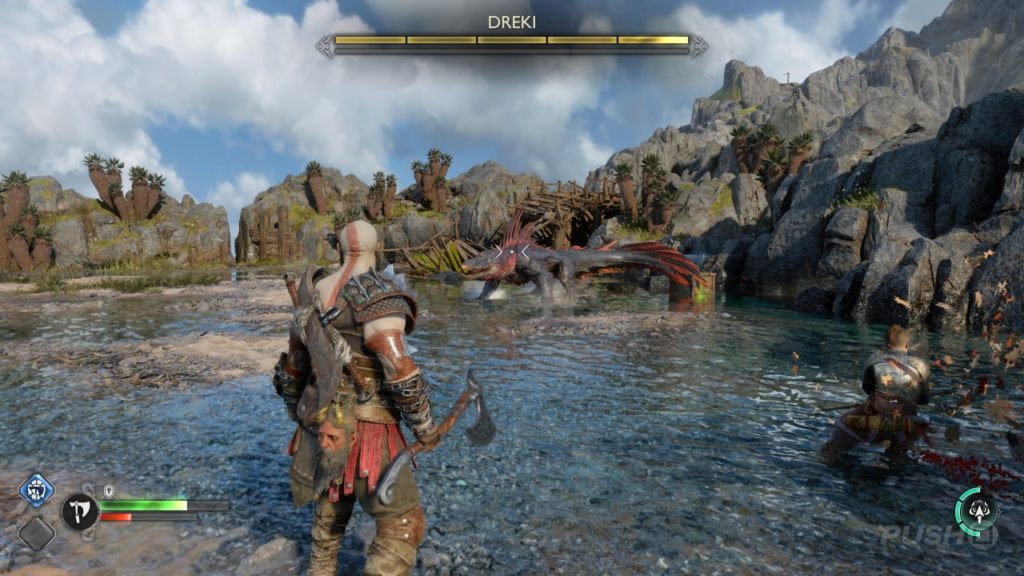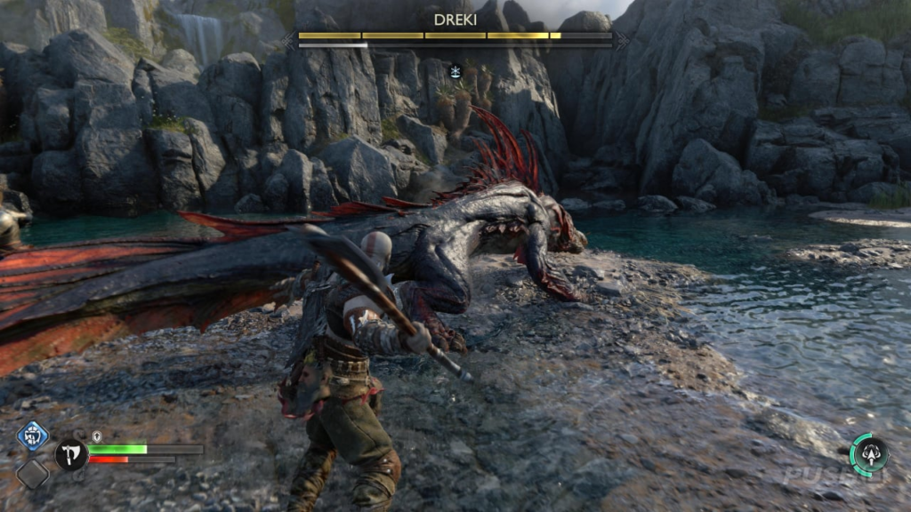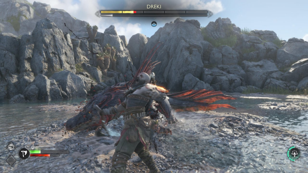 По мере того, как бой прогрессирует, Дреки начнут вызывать электрические токи. Это оглушит Кратоса, если он пойман в них, поэтому обязательно уворачивайтесь от выкатываться с дороги, когда враг заряжается — и когда он плюет на землю. После того, как вы нанесете достаточно урона, вы сможете покончить с врагом с помощью R3. Управление временно переключится на Атрея, пока он использует свой лук, поэтому сделайте выстрел и сбивайте зверя. Не забудьте разграбить его труп для новой Легкой Рунической Атаки под названием Пламя Тоски.