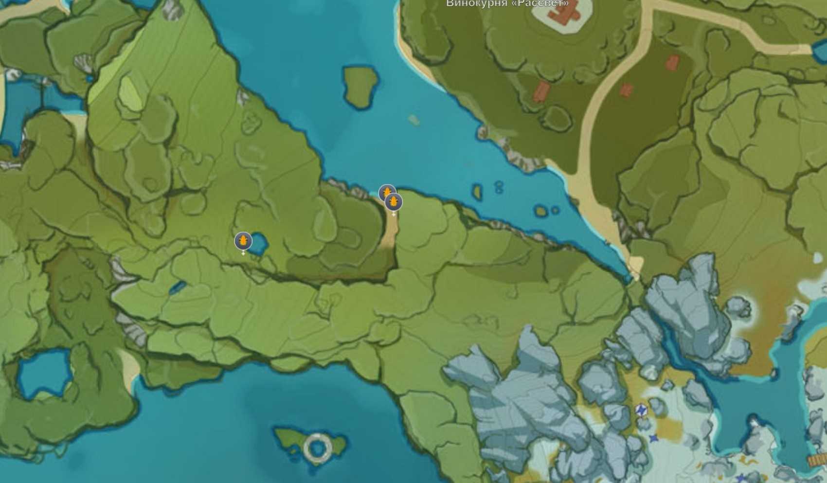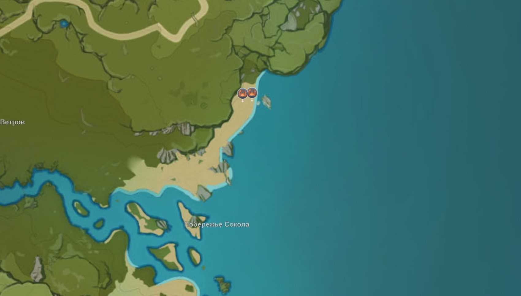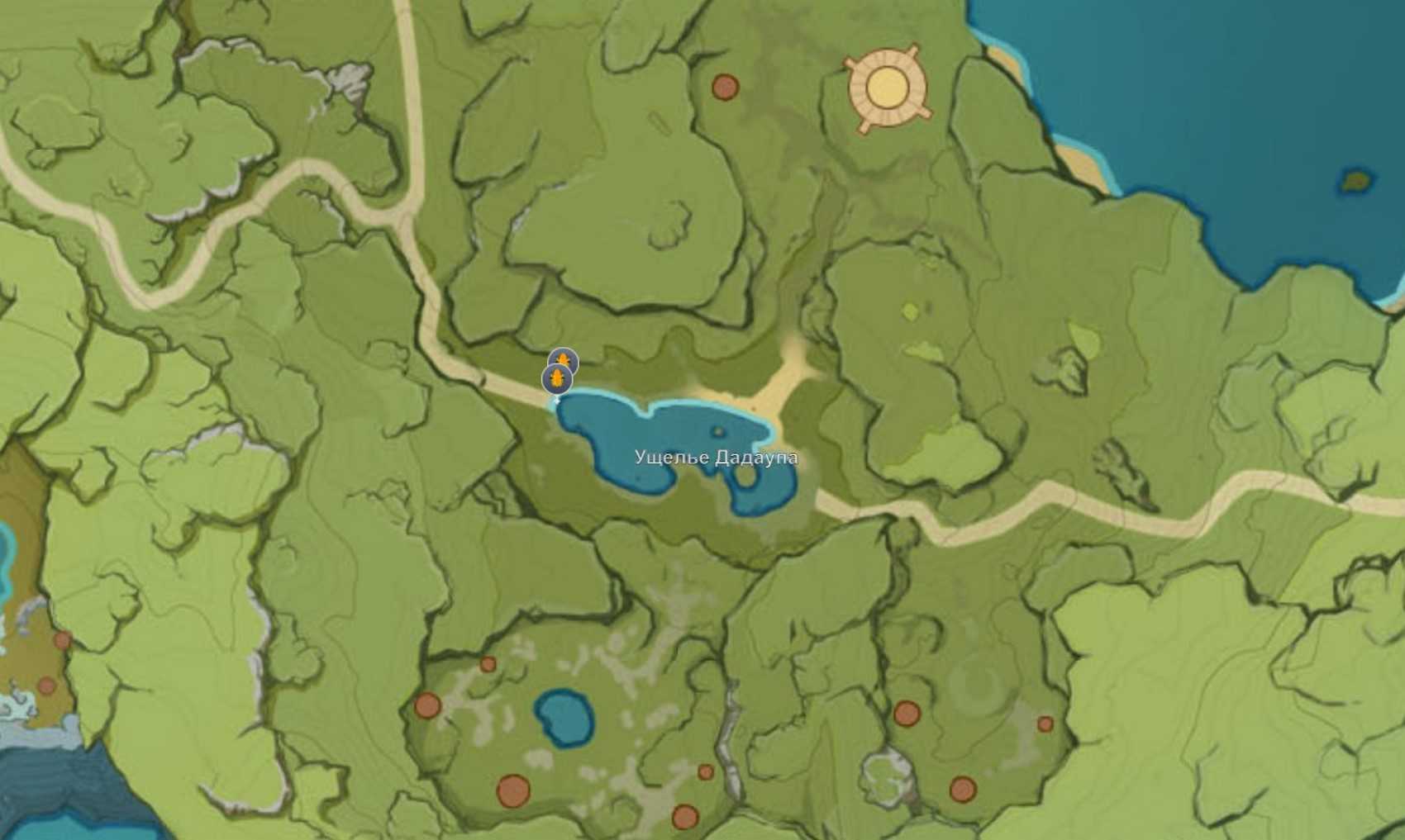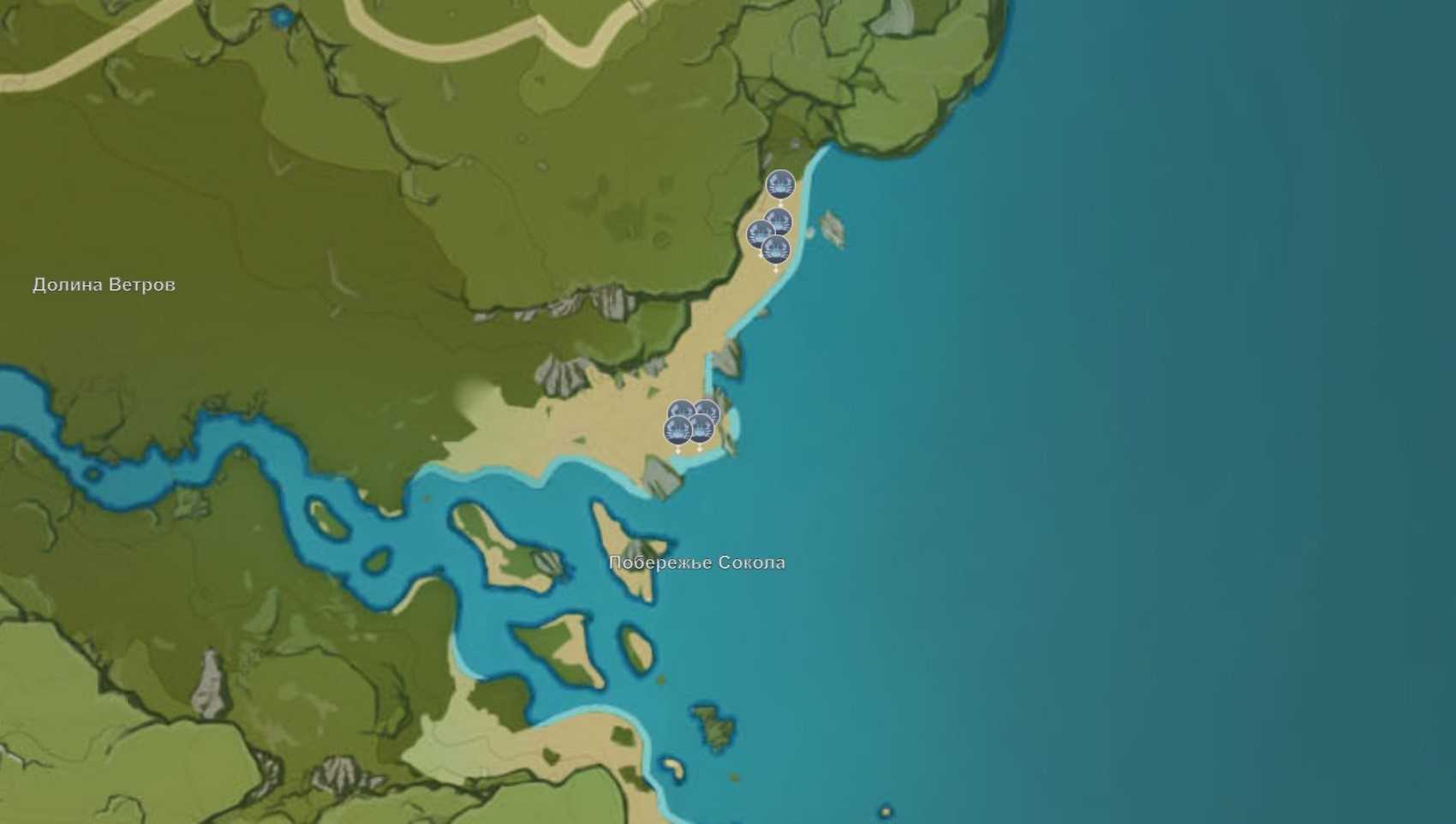 Солнечный краб. Можно найти в Мондштадте на побережье и в Ли Юэ. Можно найти на берегу недалеко от Утеса Звездолова. Все места показаны на скриншотах.