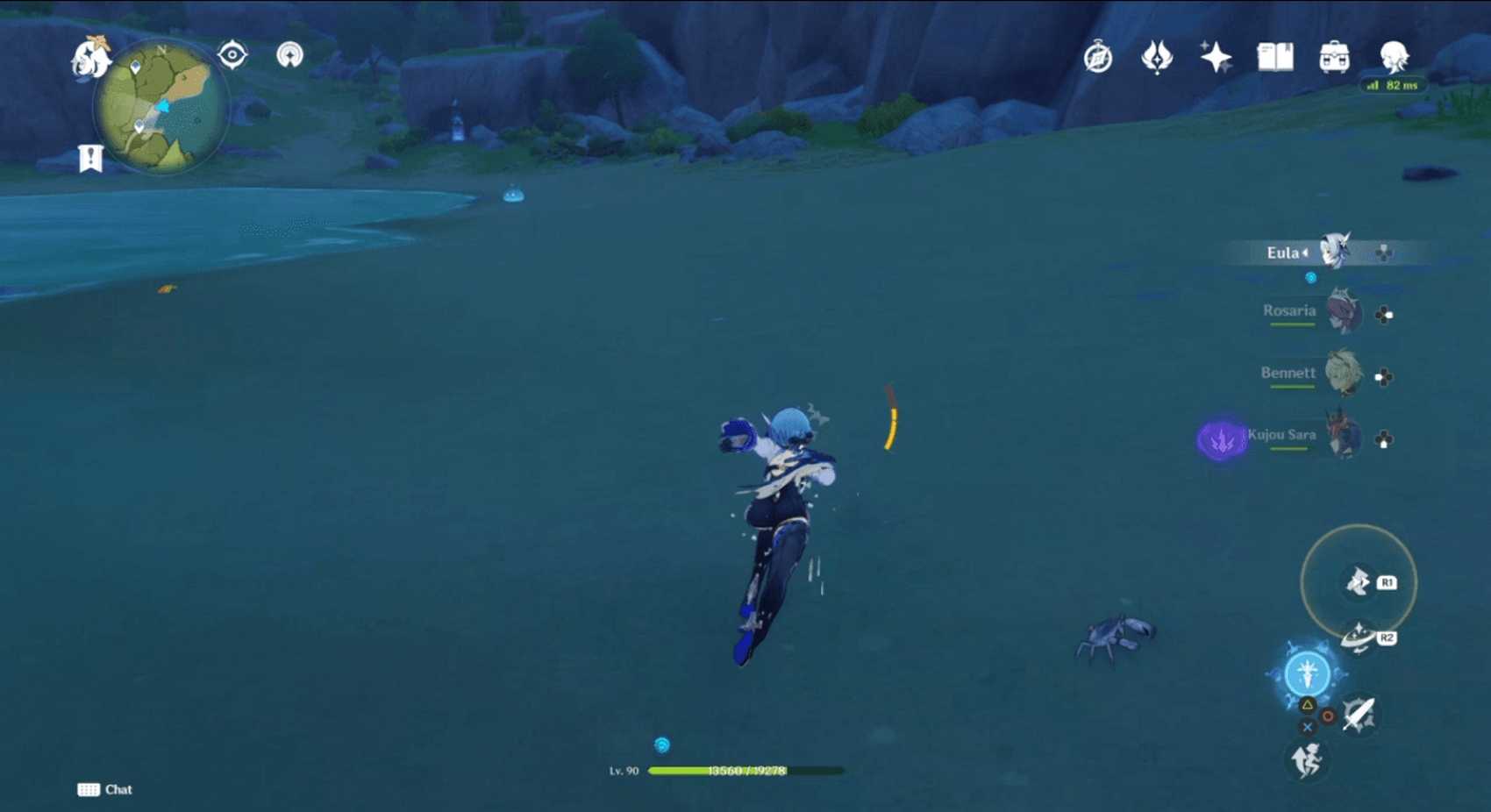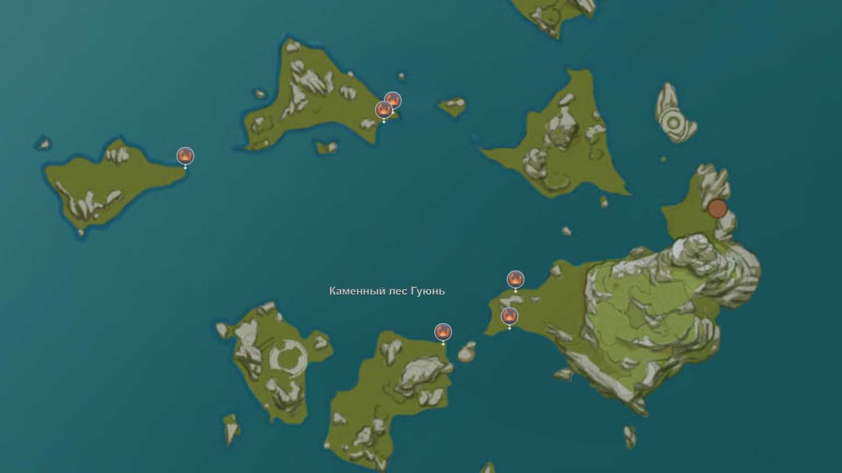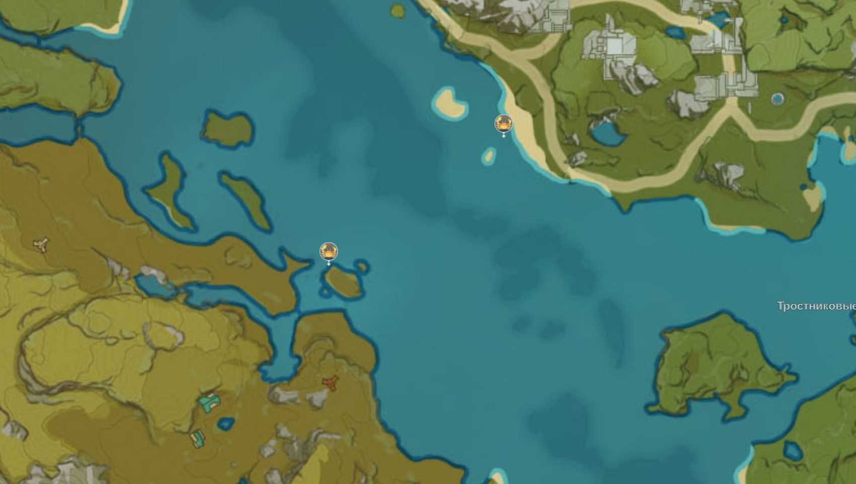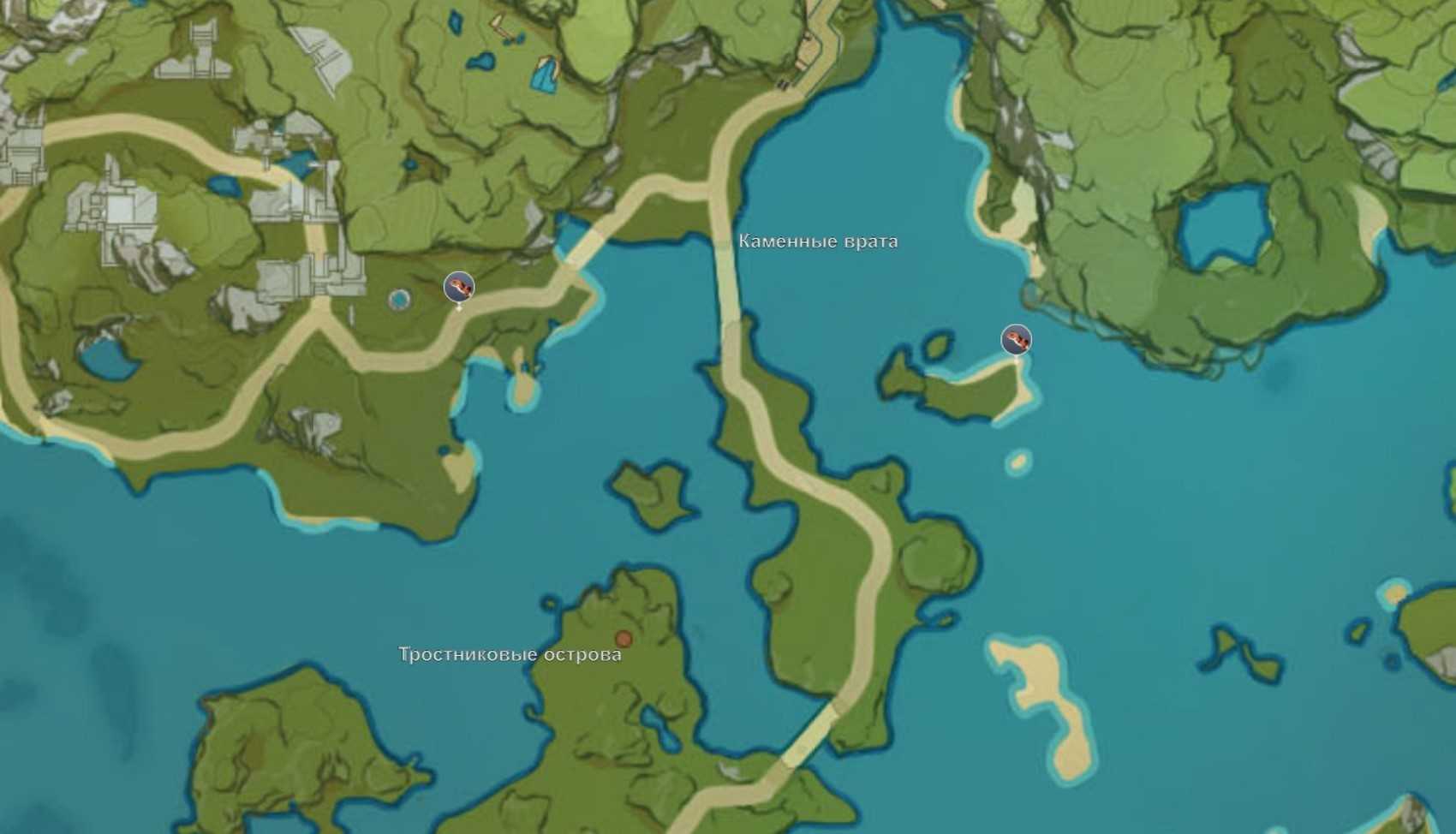 Водный краб. Обитает в Инадзуме на побережье, Мондштадте и Ли Юэ. Можно найти в Каменном лесу Гуюнь и недалеко от области Утес Звездолова. Все места показаны на скриншотах.