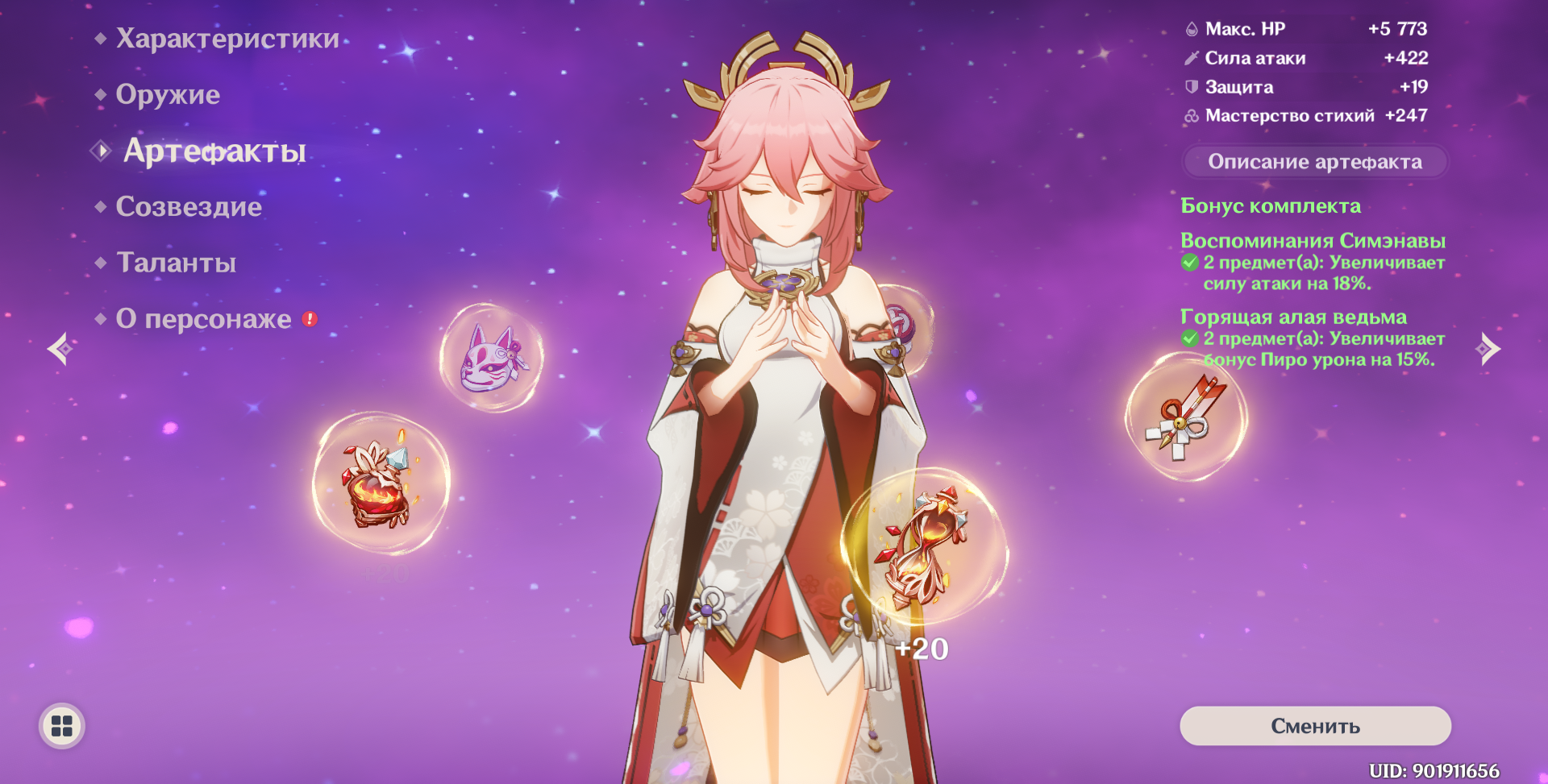 Громогласный рев ярости — неплохой набор, которые дает Яэ как можно больше Электро урона и позволяет использовать Ешку чаще. Сет универсален и если вам не везет с Эмблемой, то стоит собрать именного его;