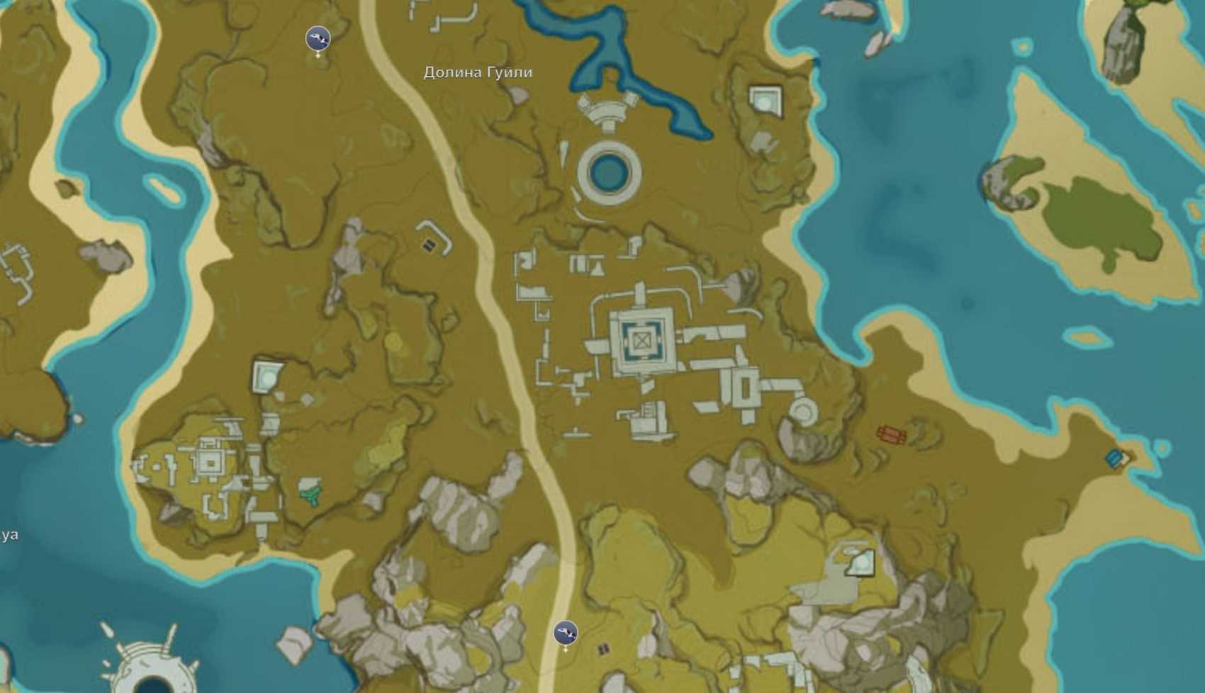 Золотистый краб. Обитает в Мондштадте, Ли Юэ, и Инадзуме на побережье. Можно найти на берегу в Каменном лесу Гуюнь. Все места показаны на скриншотах.