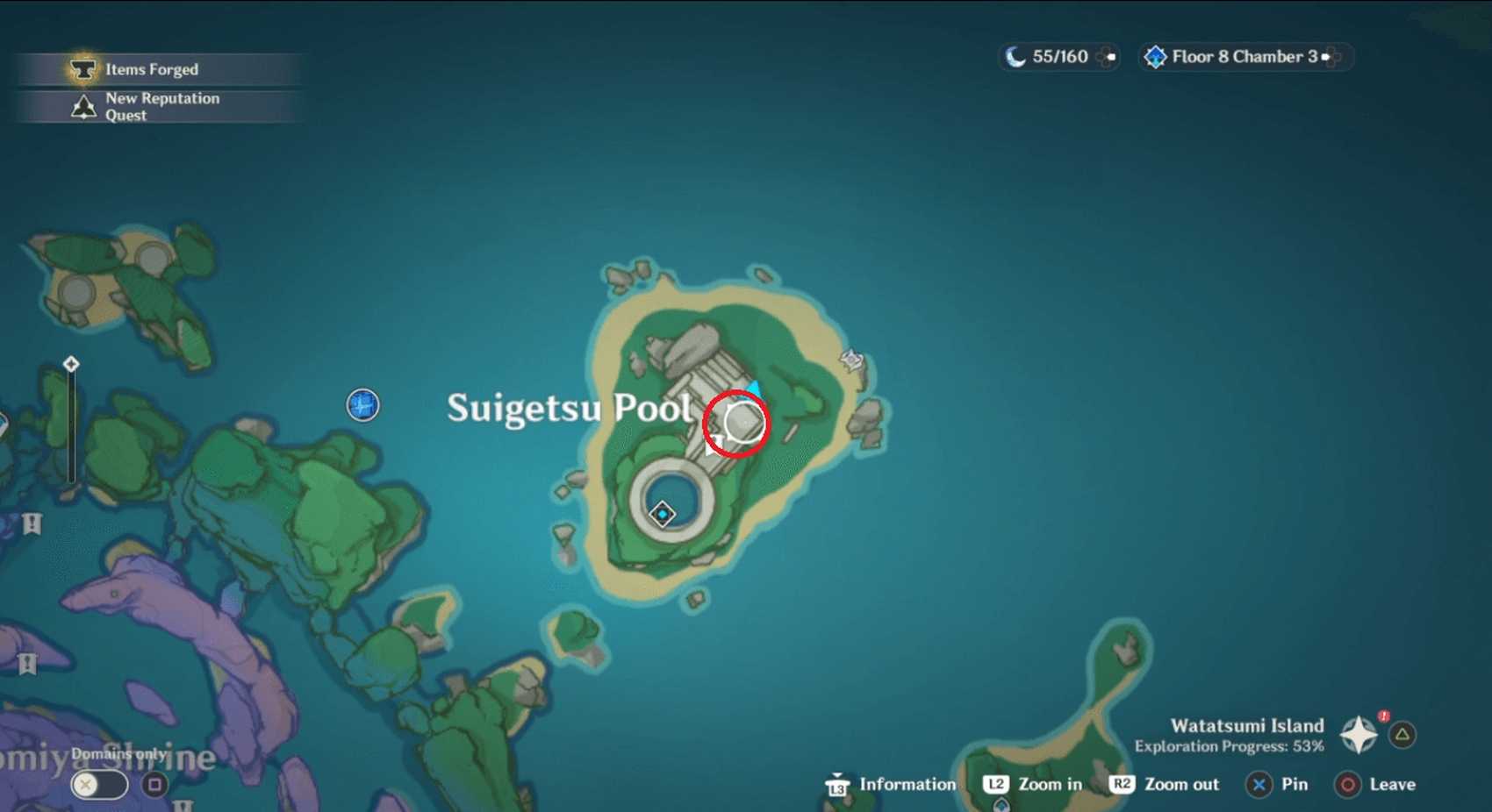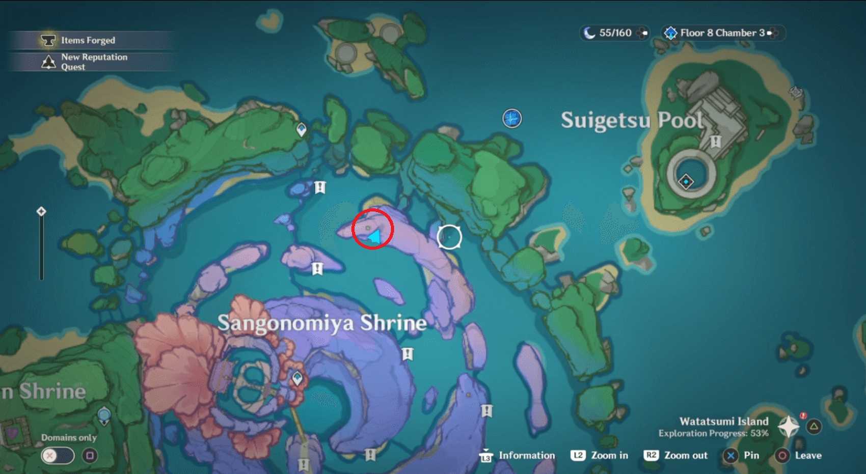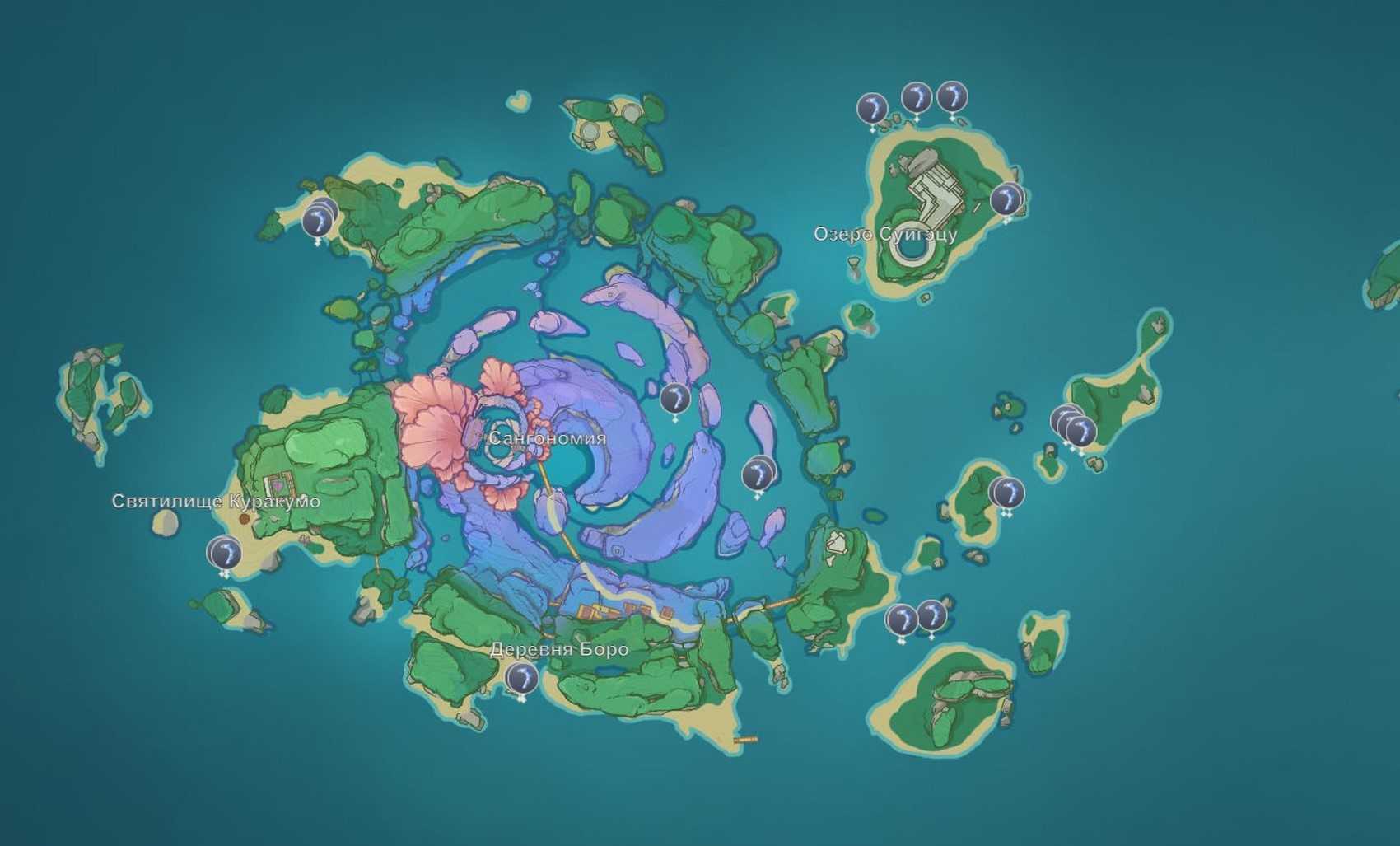 Узорный унаги. Обитают только в Инадзуме, на островах Цуруми и Ватацуми. Некоторые места обитания показаны на скриншотах.