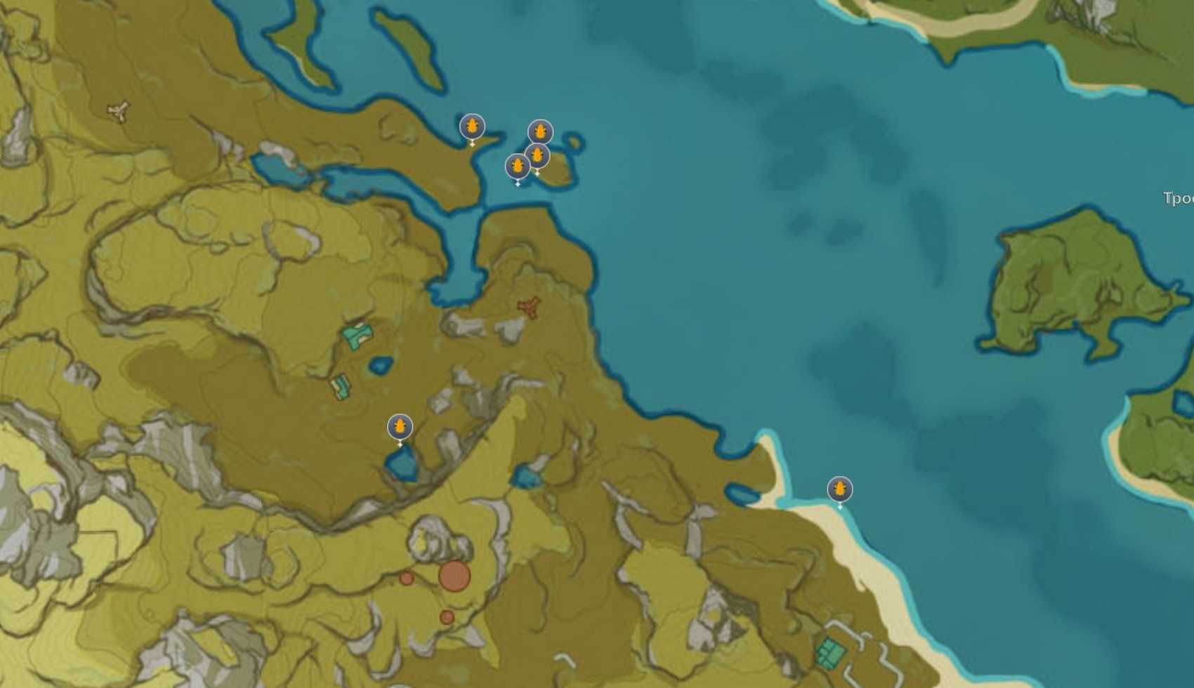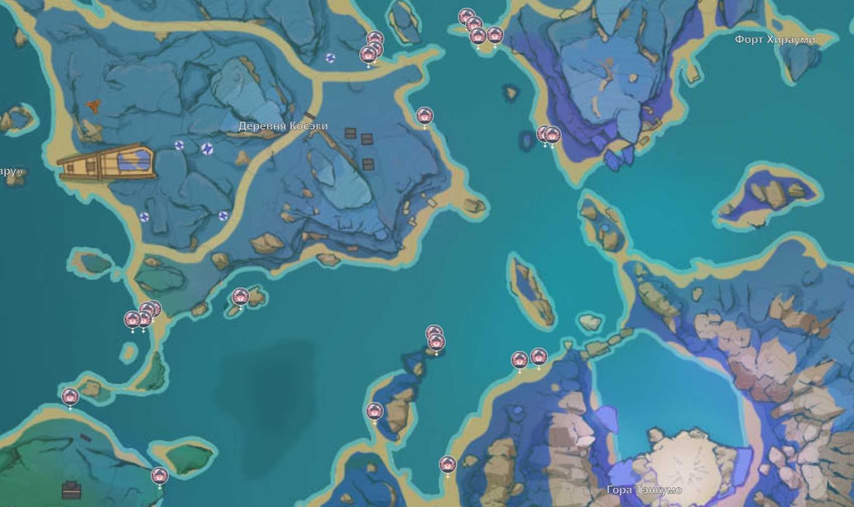 Бледно-красный краб. Обитает только в Инадзуме, на побережье. Лучше всего искать на острове Сэйрай. Места обитания показаны на скриншотах.