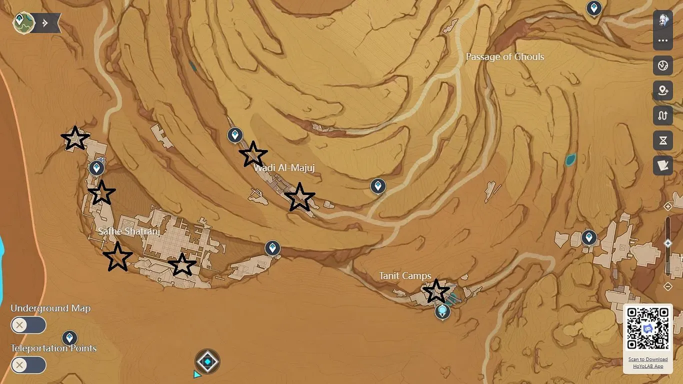 Расположение всех страниц журнала следопытов в Вади-аль-Маджудж (изображение через HoYoverse)