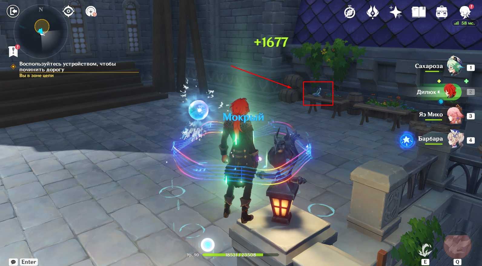 Выберите Кэйю, запрыгните на каменную площадку с сундуком и используйте его элементальное умение на Крио тотеме. Одного раза должно хватить, чтобы активировать его. Теперь выберите Эмбер и выстрелите в Пиро монумент. Советуем вам залезть на сундук и стрелять оттуда, иначе большинство ваших стрел будут просто падать в воду.