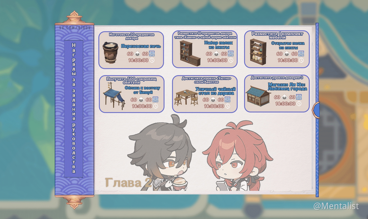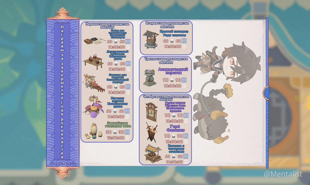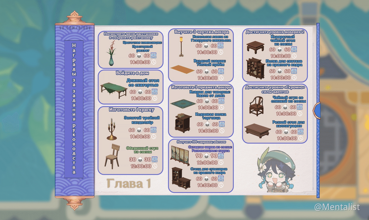 Еще в чайнике есть этакое подобие книги приключений – руководство обители, в ней есть ряд наград: чертежи, мебель, схемы готовой расстановки мебели, кусты, деревья, камни, всё это можно получить за достижение определённых игровых условий.