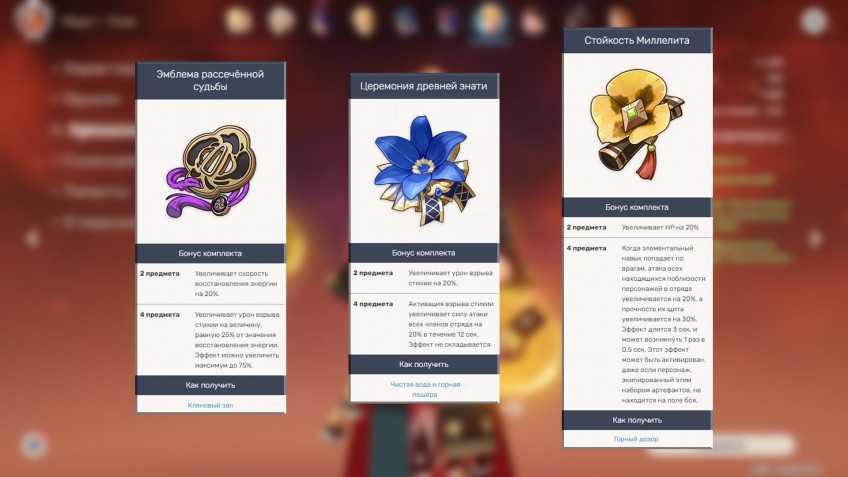 Отличным выбором для Томы будет набор из 4 церемоний древнего дворянства. Он более универсален, и если у вас нет персонажей в вашей группе, которые уже носят его (например, Беннетт), Том будет рад усилить атаку для всей группы. Многие люди используют новый набор Crests of Shattered Doom, однако есть несколько оттенков. Снаряжая Тома хорошими артефактами из этого набора, вы можете лишить вашего другого персонажа возможности повысить его эффективность, потому что набор 4x Insignia увеличивает урон от последнего, в то время как Тома низкий. Райден или Сян Лин получат гораздо больший урон от эмблемы. Но если вы по каким-то причинам собираете Тома на порчу, то четыре части эмблемы однозначно будут лучшим вариантом, но совсем не обязательно вешать на Тома полный комплект. Добавьте две части Millelite Fortress к двум частям эмблемы, и вы получите сбалансированную сборку артефактов для чистых характеристик: + 20% восстановления энергии и + 20% HP. Это принесет пользу всему отряду.Если вы еще не на высоком уровне и не можете фармить 5 * сетов, Том также сделает набор инструктора, если вы используете его в отряде, основанном на элементальной реакции. С ним Том улучшит элементальное мастерство всех членов команды после создания хотя бы одной элементальной реакции.Теперь статистика артефакта. Тома требует значительного количества регенерации энергии, чтобы постоянно использовать свой максимум — около 200-220% — но если у вас есть C4, это значение будет ниже. Если вы играете в команде Pyro, где другие герои также генерируют частицы Pyro (они работают как «батарея» для Тома), этот показатель будет еще меньше. То же самое можно сказать и о Копье Фавониуса, которое будет бросать больше частиц в Тома, если вы постоянно будете уничтожать критиков. Одним словом, сосредоточьтесь в первую очередь на своей ситуации и постарайтесь восстановиться ровно настолько, чтобы ульт Тома всегда был готов вернуться.