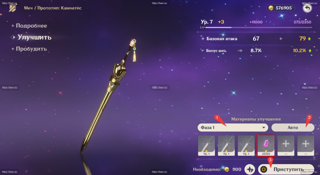 Имея оружие 1 уровня, мы можем повысить его уровень вплоть до 20 используя другое оружие, которое мы собрали в качестве наград с сундуков, победу над монстрами и за выполнение заданий. Сделать это довольно просто – вам нужно выбрать в правом нижнем углу экрана материалы для улучшения. Проще всего сделать это выбрав класс материалов для улучшения из выпадающего списка – Фаза 1, Фаза 2 и ниже или Фаза 3 и ниже и нажав кнопку Авто. Под Фазой 1 понимается оружие с одной звездой, под Фазой 2 – оружие с двумя звёздами и так далее. Нажатие на кнопку Авто автоматически добавить в материалы для улучшения соответствующий класс оружия, имеющийся в вашем инвентаре. Следует отметить, что когда оружие определённого класса закончится, то к использованию будет предлагаться Руда усиления соответствующей звёздности, а её количество вы можете регулировать выбрав её кликом мышки или тапом по экрану вашего гаджета.