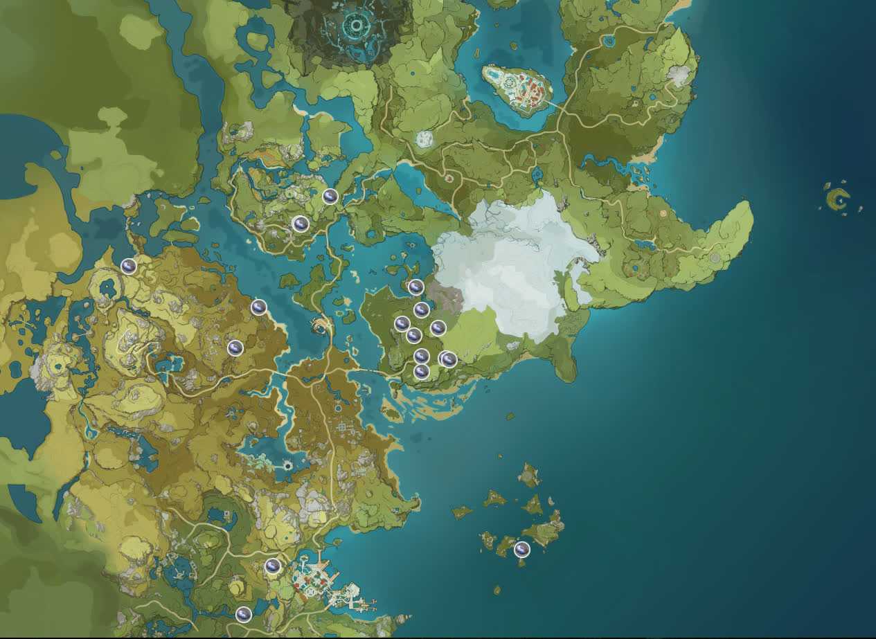 На изображении ниже отмечены точки спавна объектов в Ли Юэ, из которых можно получить низкокачественные артефакты. Этот маршрут на сегодняшний день является самым удобным для ежедневного фарма артефактов.