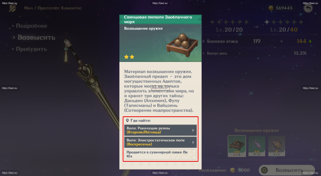 На момент достижения максимального уровня оружия, после которого требуется его возвысить, у вас может не быть необходимых предметов для улучшения. И для того, чтобы ответить на вопрос, где их взять, достаточно просто кликнуть мышкой или тапнуть по экрану на их иконке. В ответ на это действие вам откроется информация о том, где взять или купить необходимый ингредиент и когда это возможно сделать. Да, да – получить тот или иной предмет в подземельях или испытаниях может быть возможно только в определённый день недели или время.