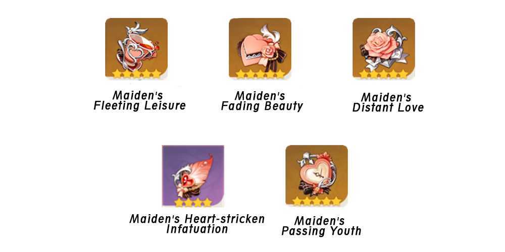 Набор Maiden Beloved — единственные пятизвездочные артефакты с усилением на основе исцеления. Когда ты единственный, у кого есть определенные характеристики; вы обязательно попадете в список 10 лучших (как здесь), хотя вы можете оказаться в самом последнем в этом списке (как и здесь). Этот набор можно получить в Долине Памяти, в зале Танца Стали II — V.