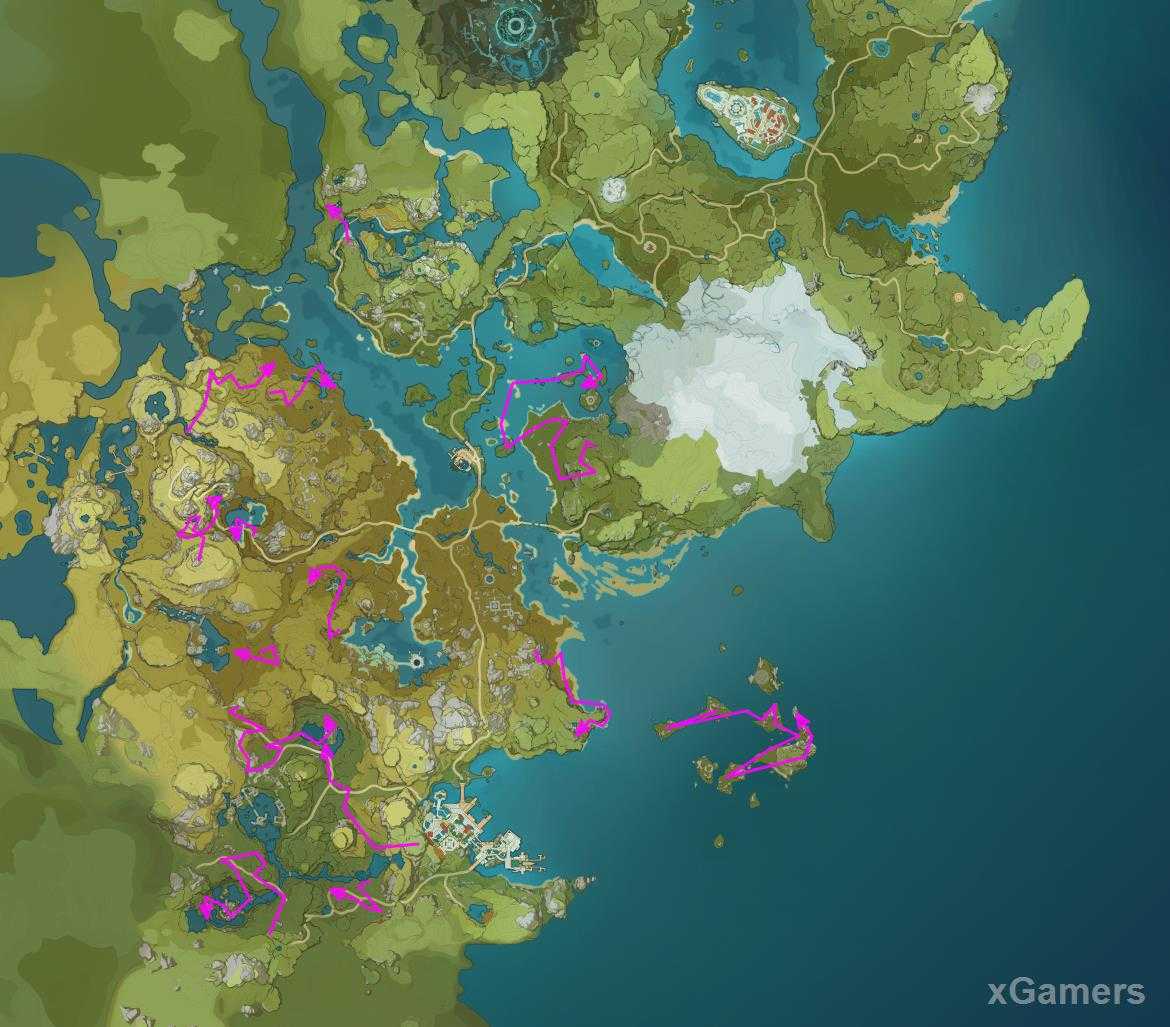 А на этих изображениях показаны удобные маршруты для фарма артефактов в Инадзуме.