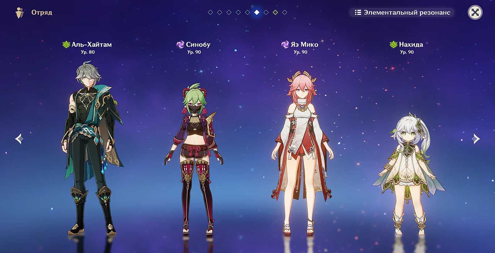 - Аль-Хайтам, Нахида, Яэ Мику, Куки Синобу.