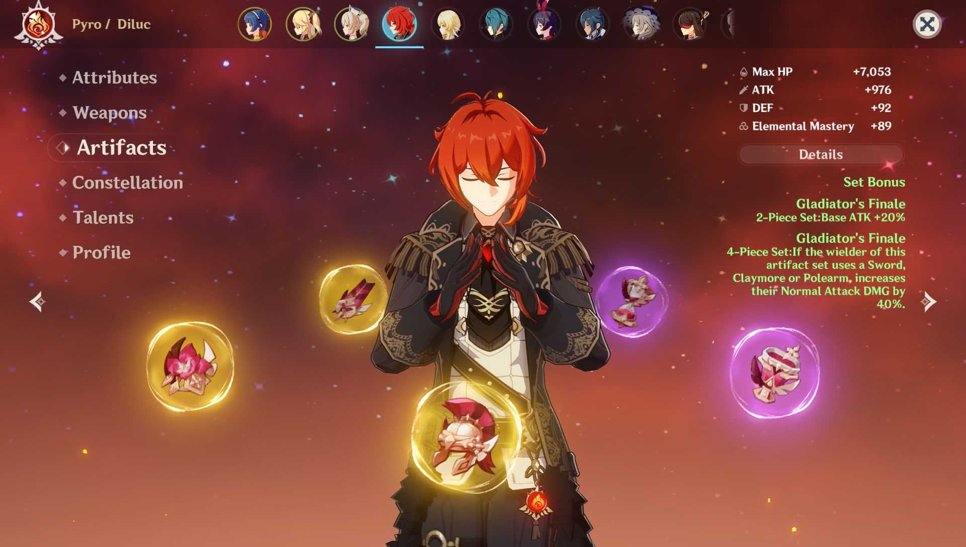 Как и многие другие сборки DPS в Геншин Импакт, Дилюку очень пригодится набор артефактов Gladiator’s Finale. Набор из двух частей дает пользователю увеличение процента атаки на 18 процентов, а набор из четырех частей дает еще 35 процентов, потому что он владеет клеймором. В качестве альтернативы, многие игроки также находят применение в сочетании набора из двух предметов «Гладиатор» с набором из двух предметов «Окровавленное рыцарство» для увеличения физического урона на 25 процентов.