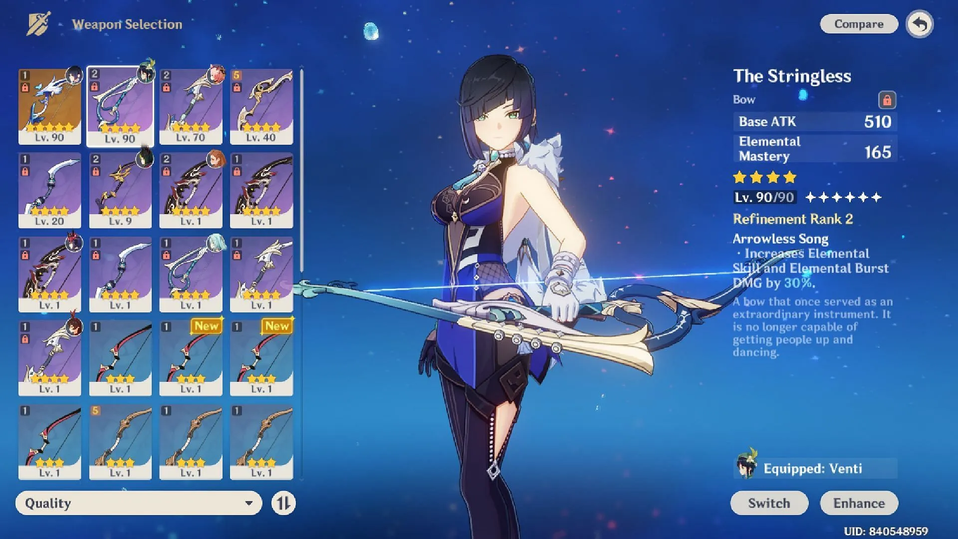 Многое зависит от того, хватит ли энергии для использования элементарного взрыва Стрельца во время перезагрузки. Если рекуперация энергии составляет менее 150%, рекомендуется поискать лук, который увеличивает рекуперацию энергии. В противном случае вы можете получить оружие, увеличивающее максимальное количество HP, силу атаки, серьезный урон и вероятность серьезных попаданий.