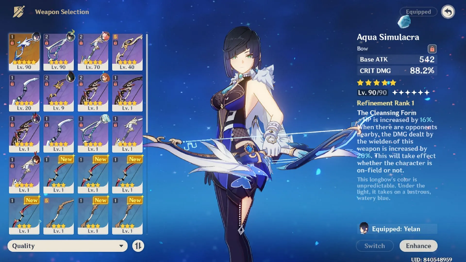 Первым в списке стоит Aqua Simulacra, фирменное оружие Елан, и само собой разумеется, что это ее оружие BiS (лучшее в слоте) в Genshin Impact. Он имеет самый высокий показатель CRIT DMG 88,2% на уровне 90. Кроме того, он увеличивает ее максимальное здоровье на 16% на R1, а также увеличивает ее DMG на 20%, когда поблизости есть враги.