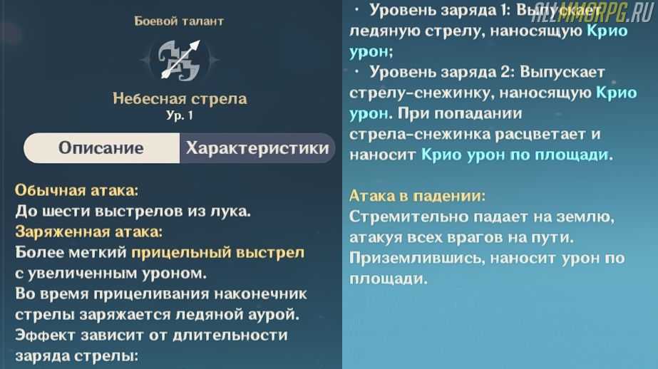 - Первый уровень. Герой запускает в цель стрелу, наносящую крио-урон;