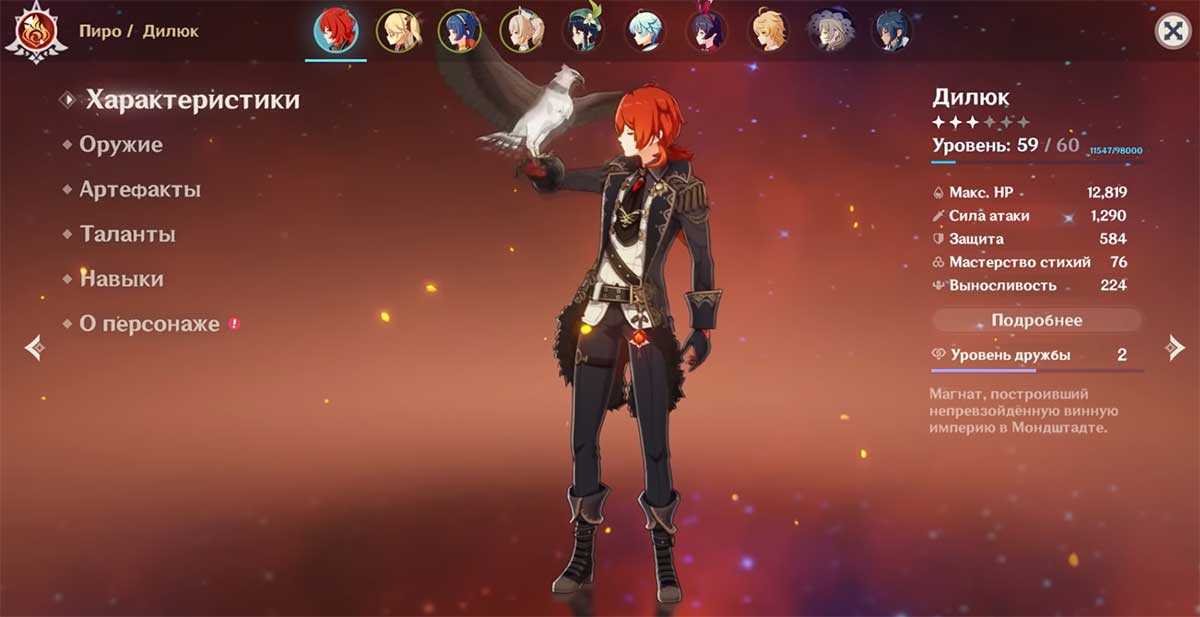 - Кадзуха — за каждое возвышение пятизвездочного персонажа +29. На максимальном уровне значение достигнет 115;