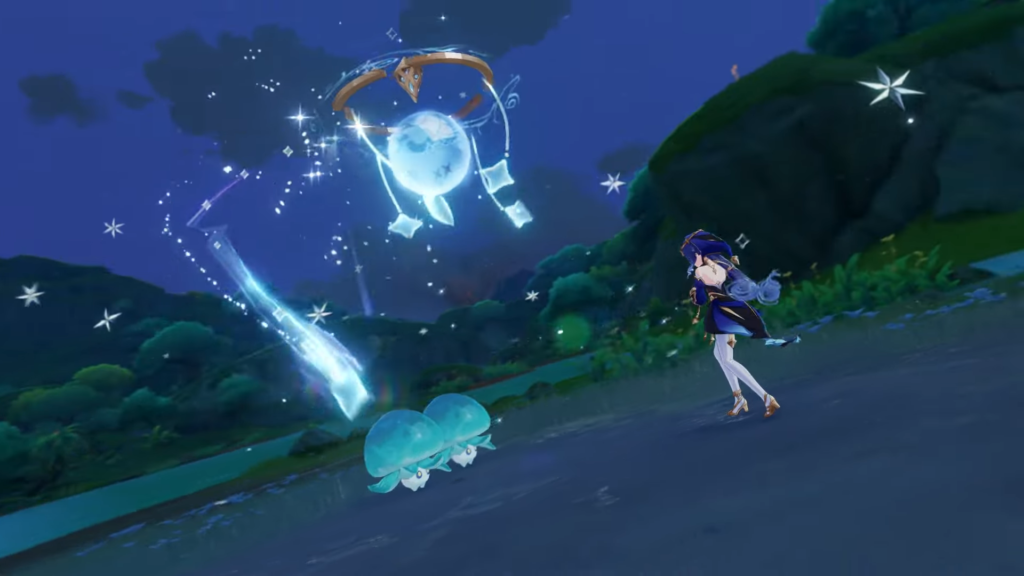 Элементальный навык Лейлы дает ей щит, который создает 1 заряд (Ночную звезду) каждые 1,5 секунды или 2 заряда каждый раз, когда другой персонаж использует Элементальный навык. Как только будет накоплено 4 заряда, щит выпустит Метеоры, которые наносят Крио-урон ближайшим врагам.