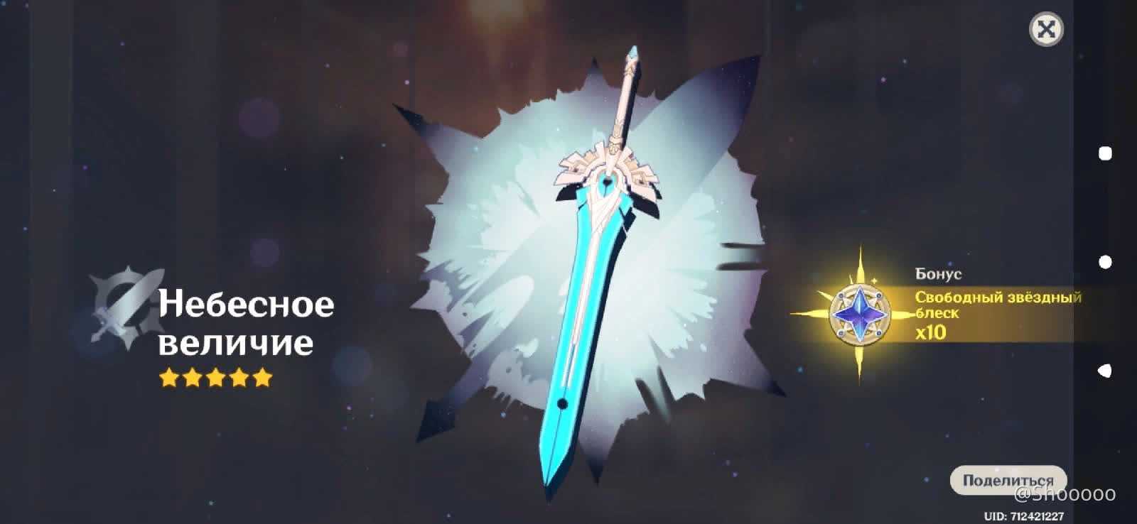 Небесное величие — пятизвездочный двуручный меч. По умолчанию он повышает урон персонажа на 8-16% (зависит от прокачки). Также у него есть эффект, который активируется после использования взрыва стихии или удачного попадания по противнику обычной или заряженной атакой. Согласно этому эффекту из меча вылетают неосязаемые лезвия, наносящие всем попавшим в зону действия врагам урон в количестве 80-160% от общего дамага персонажа. Безупречный меч для персонажей, которые любят бегать с двуручными клинками.