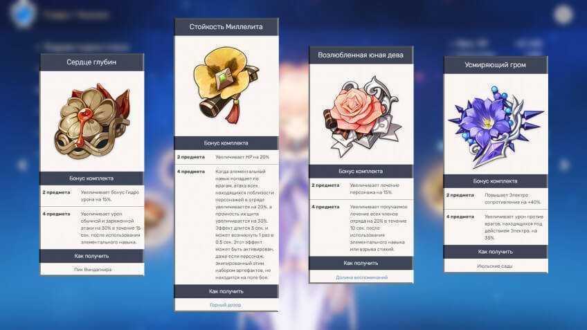 Совет: бонус из 4 частей не суммируется, поэтому если вы играете Мика с персонажем, который уже использует этот набор из 4 частей, вы можете собрать его из 2 частей Эмблемы рассечённой судьбы и 2 частей Стойкости Миллелита.