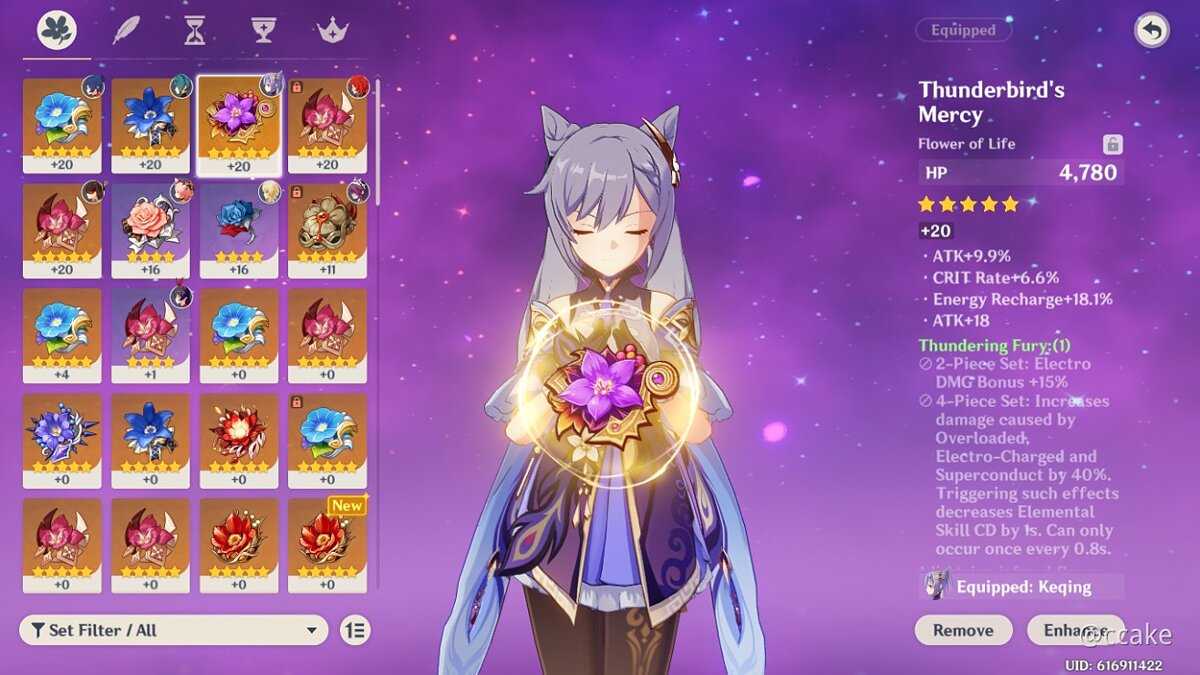 «Громогласный рёв ярости» (Thundering Fury Set): 2 части: увеличивает бонус электро урона на 15%. 4 части: увеличивает урон статусов Перегрузка, Заряжен и Суперпроводник на 40%. Наложение этих статусов уменьшает время отката элементального навыка на 1 секунду. Может возникнуть раз в 0.8 секунд. Получить его можно в подземелье «Июльские сады». Подробнее про артефакты можно узнать в отдельной статье.