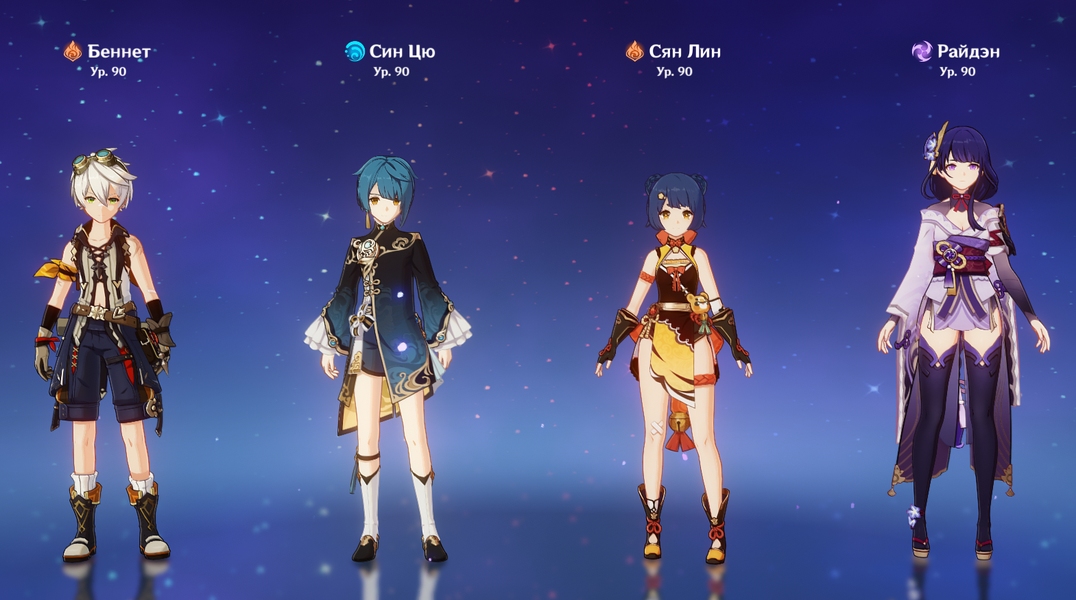 - Пиро: Эмбер, Беннет, Дилюк, Сян Лин, Ёимия, Кли;