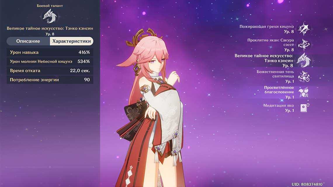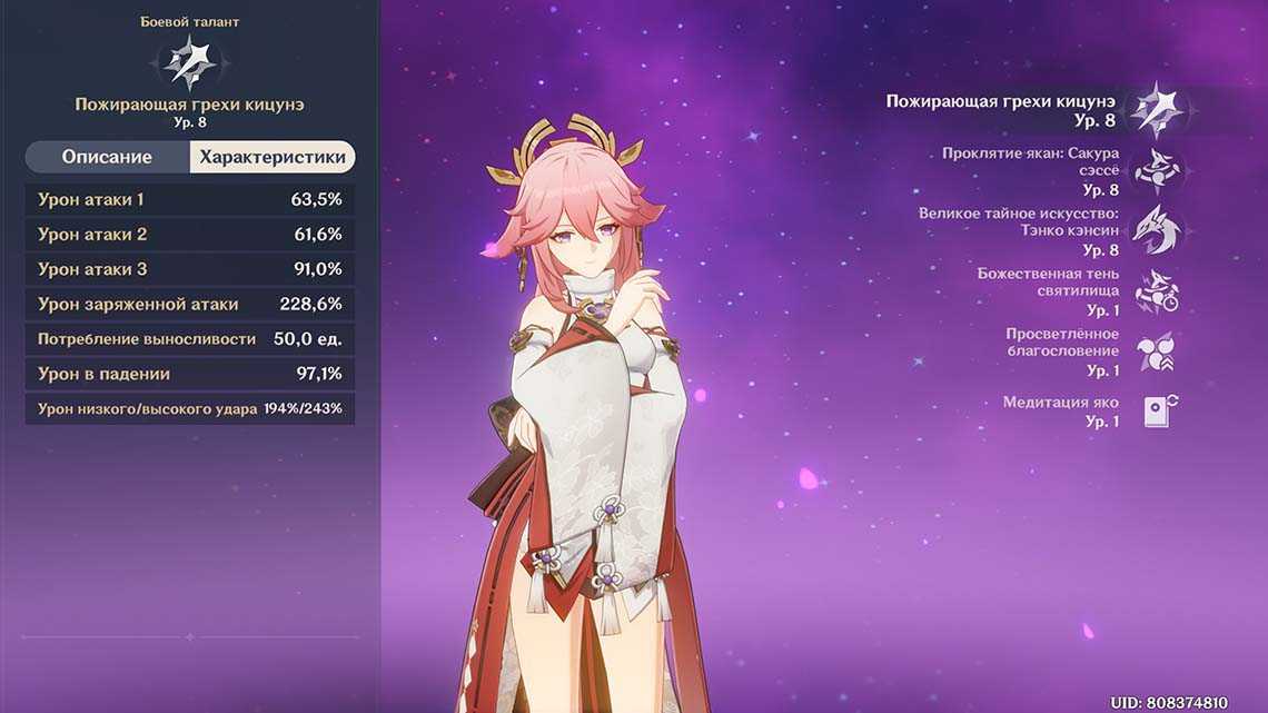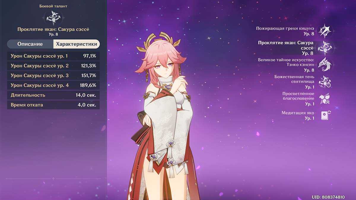 В частности, её каст могут прервать любые сбивающие атаки, заморозка или перегрузка. Поэтому играть Яэ лучше под щитами (например, от Дионы, Ноэлль или Чжун Ли), либо чаще использовать её специальное умение — «Сакура сэссё».