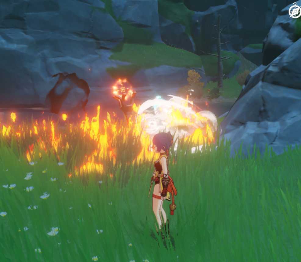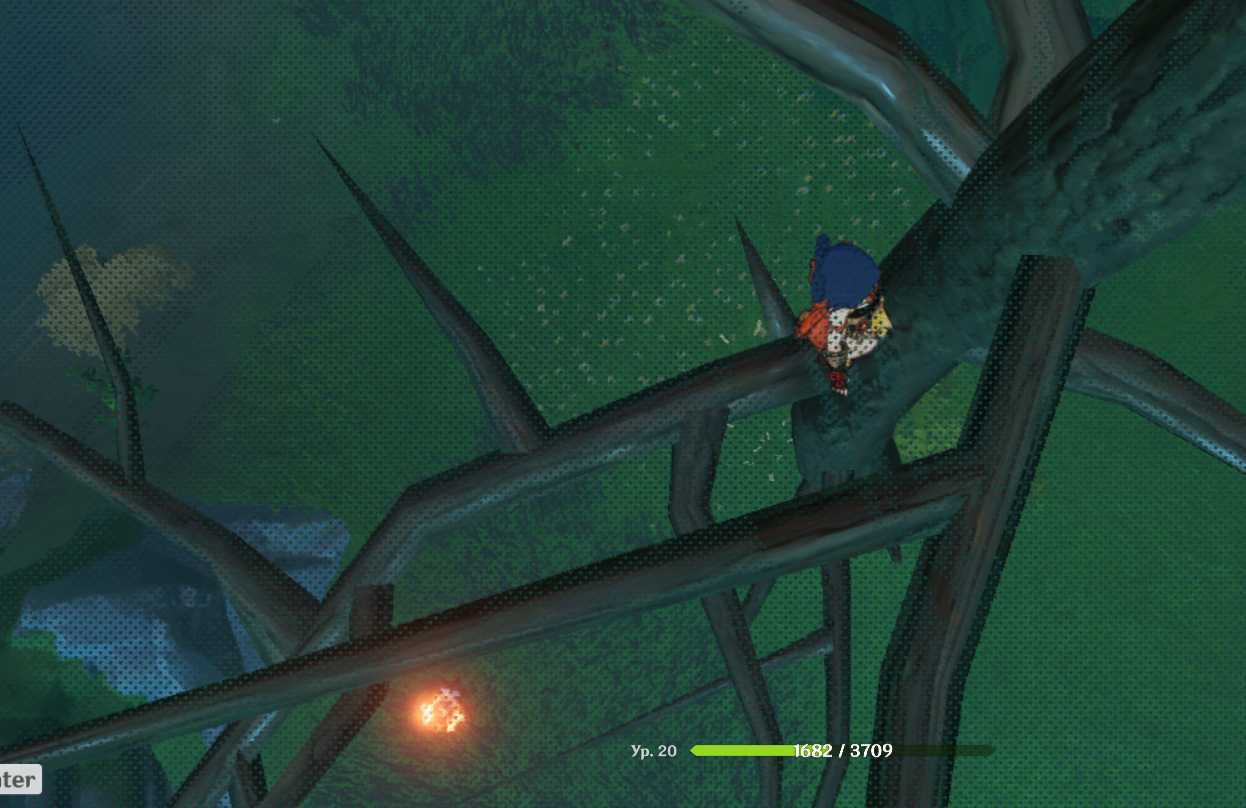 Например, можно залезть на ближайшее дерево. Или на ближайшей горе — тоже сработает. А вот по камню, который видно на кадре выше, есть смысл ползать, только если у вас есть Казуха. Остальные персы не прыгнут.