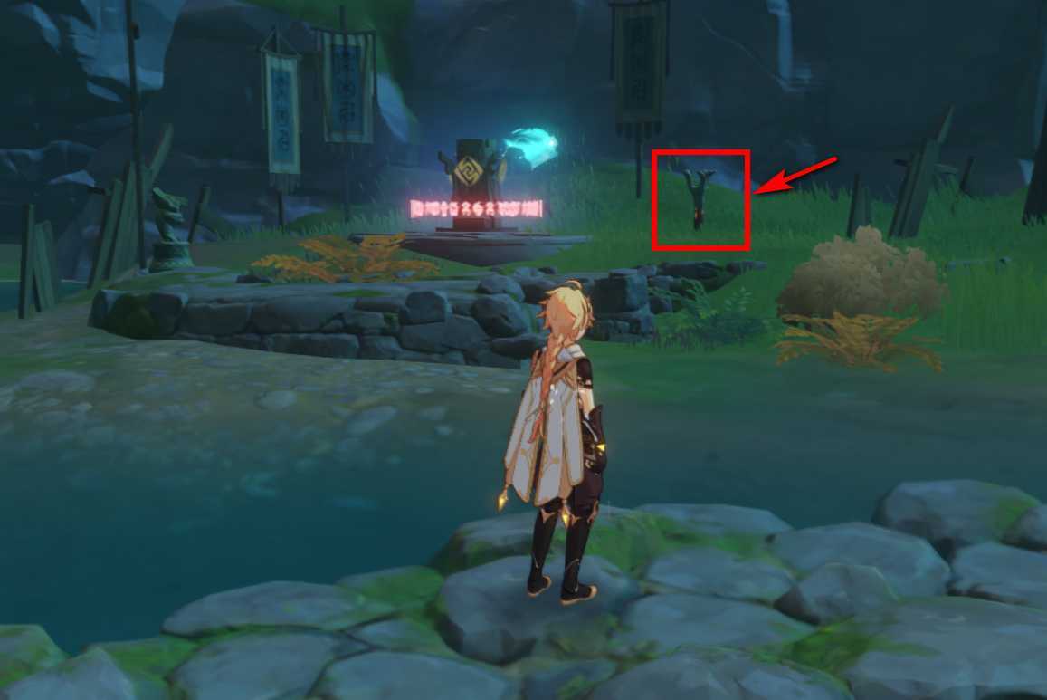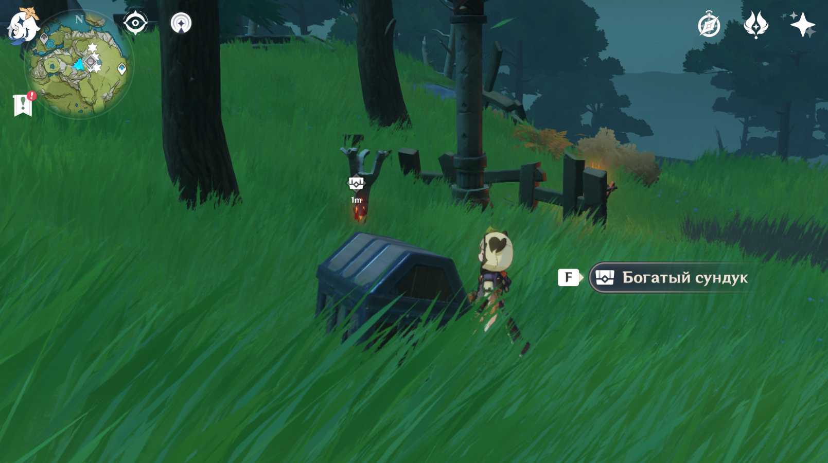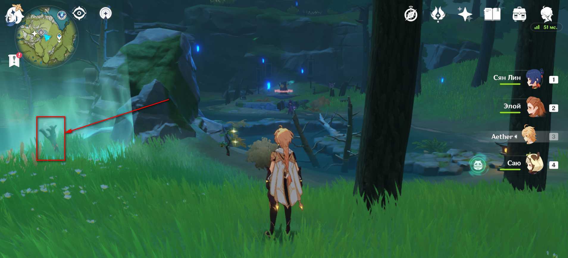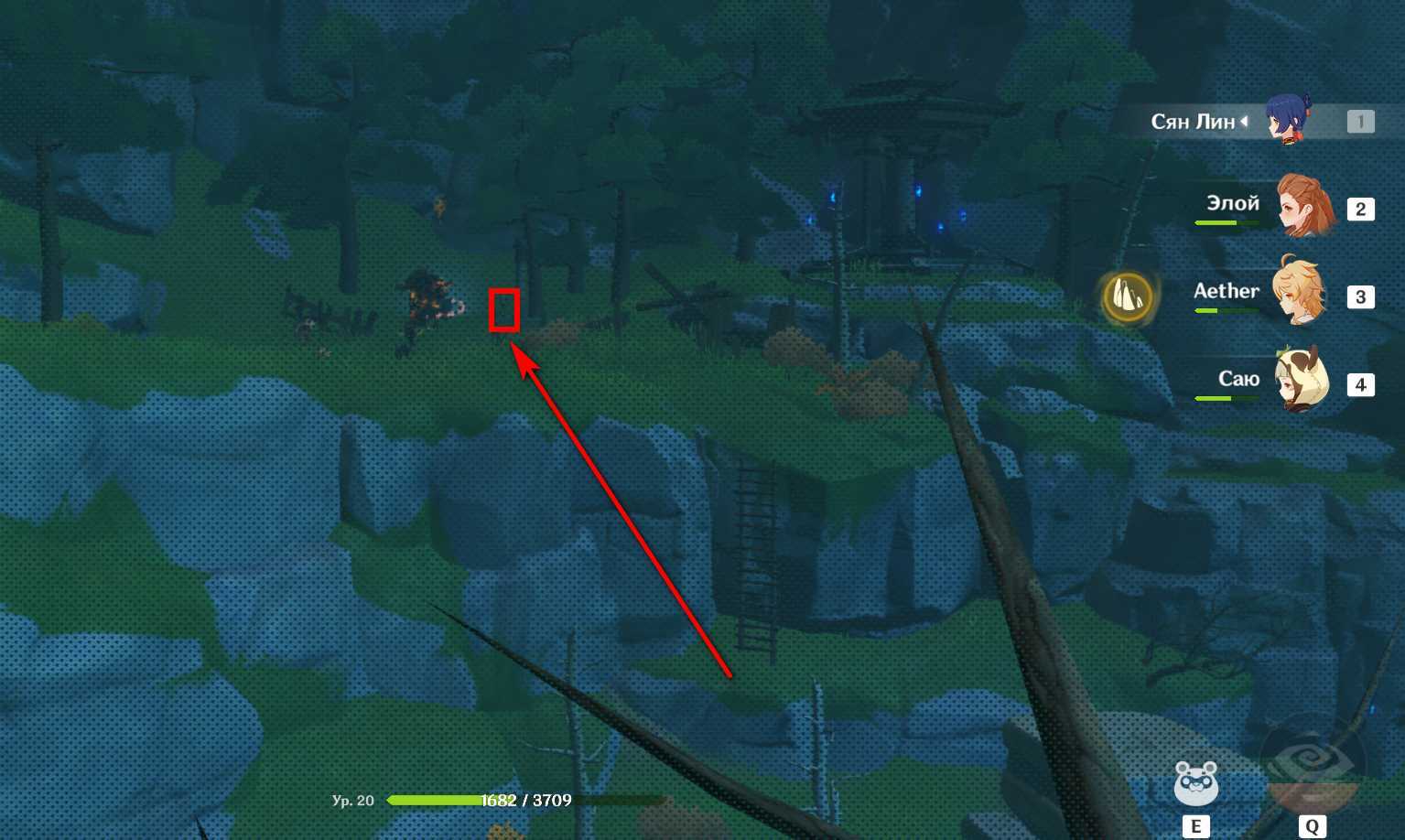 Рядом с ним вас ждет группа хиличурлов. Будьте осторожны с шаманом, сделайте острые кусты, которые легко убить. Вы можете просто уворачиваться от митахурла, пока вся эта мелочь не погибнет. Затем снимаем ящик, включаем фонарик, прыгаем к самой близкой геокуле и идем решать следующую часть головоломки.
