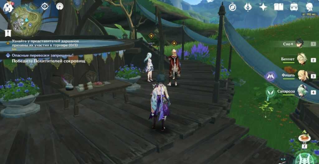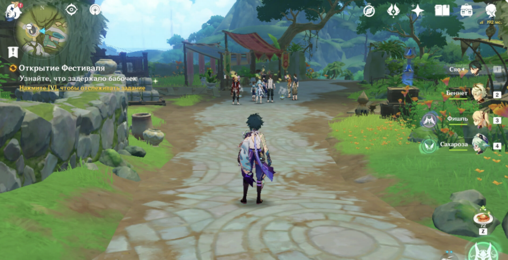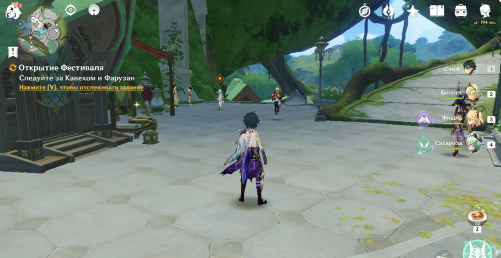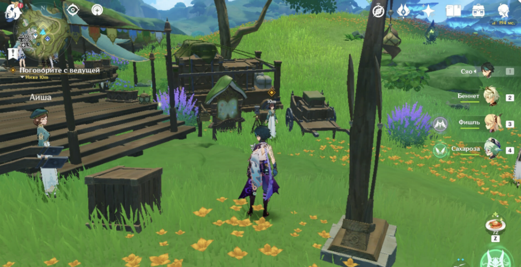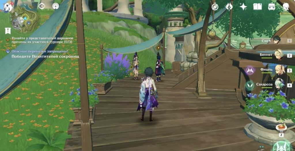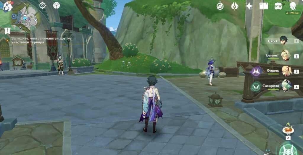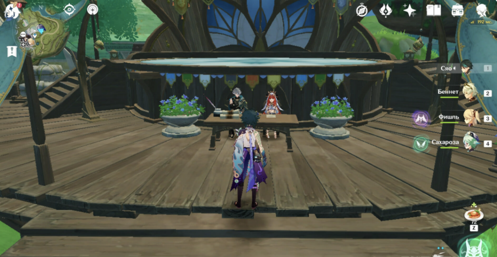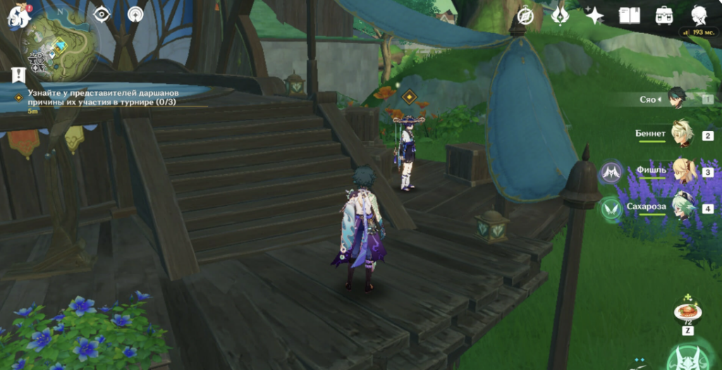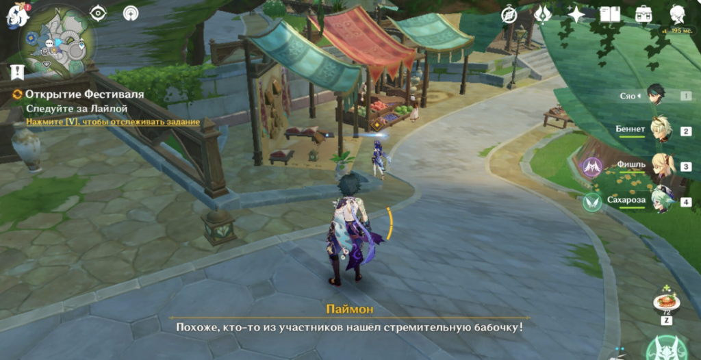 Карина предложит путешественникам познакомиться с другими наблюдателями. Найти их можно за столиком возле сцены. Анонсировать начало соревнований и подсчитывать очки участников будут уже знакомые герои Аль-Хайтам и Нил. Поговорите со своими друзьями, чтобы начать первый этап игры и узнать правила и цели испытания. Участники должны ловить бабочек.