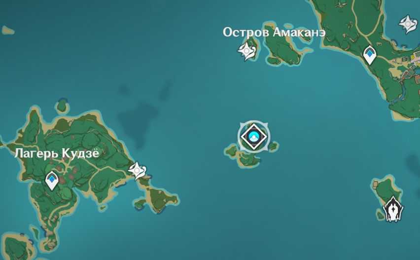 На островке, расположенном к западу от города Инадзума и к югу от острова Амаканэ, можно найти множество глиняных горшков. Их точное расположение показано на скриншоте ниже звездочками. Когда уничтожите последнюю вазу, вы увидите сообщение о приближении подкрепления.
