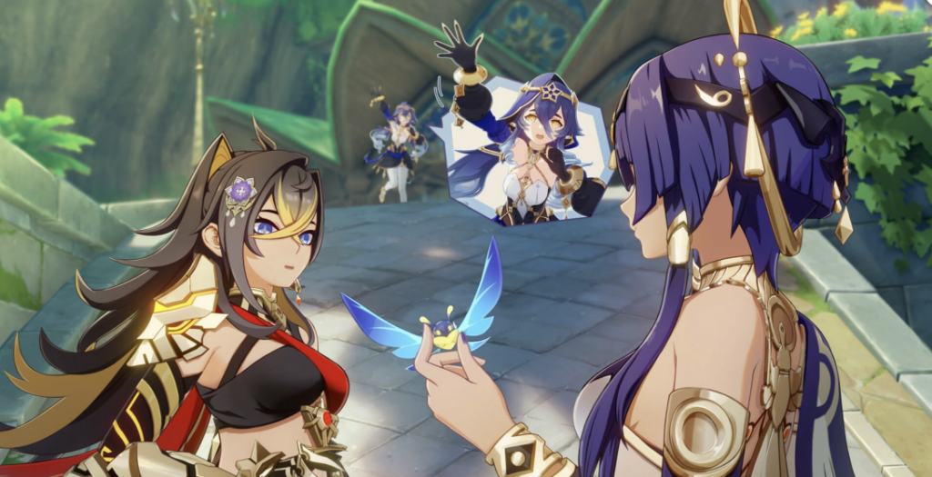 К разговору с Сайно присоединятся другие конкурсантки Кавех и Фарузан. Молодые оценят ситуацию и отправятся на дальнейшие поиски стремительных бабочек. Следуйте за убегающими учеными по городу, пока не доберетесь до финиша.