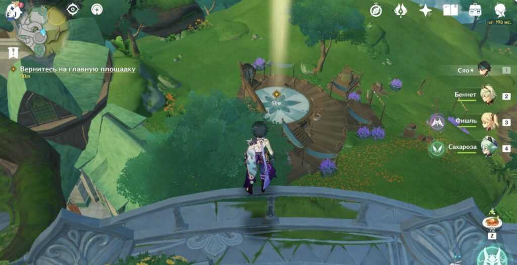 - Третий страж спрятан под водой, недалеко от статуи семи Архонтов. Победите единственного здесь летающего врага и активируйте платформу, чтобы слить воду из бассейна.