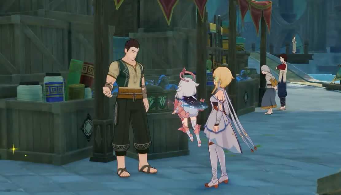 В Порт-Ормосе вы встретитесь с Аль-Хайтамом. Он отправит вас к Дори, чтобы вы купили необходимую вещь. Сначала встретьтесь с ее осведомителем Латишем. В диалоге с ним выбирайте: «Мы хотим купить несладкие фрукты харра». После вместе с Раунаком отправляйтесь на склад.
