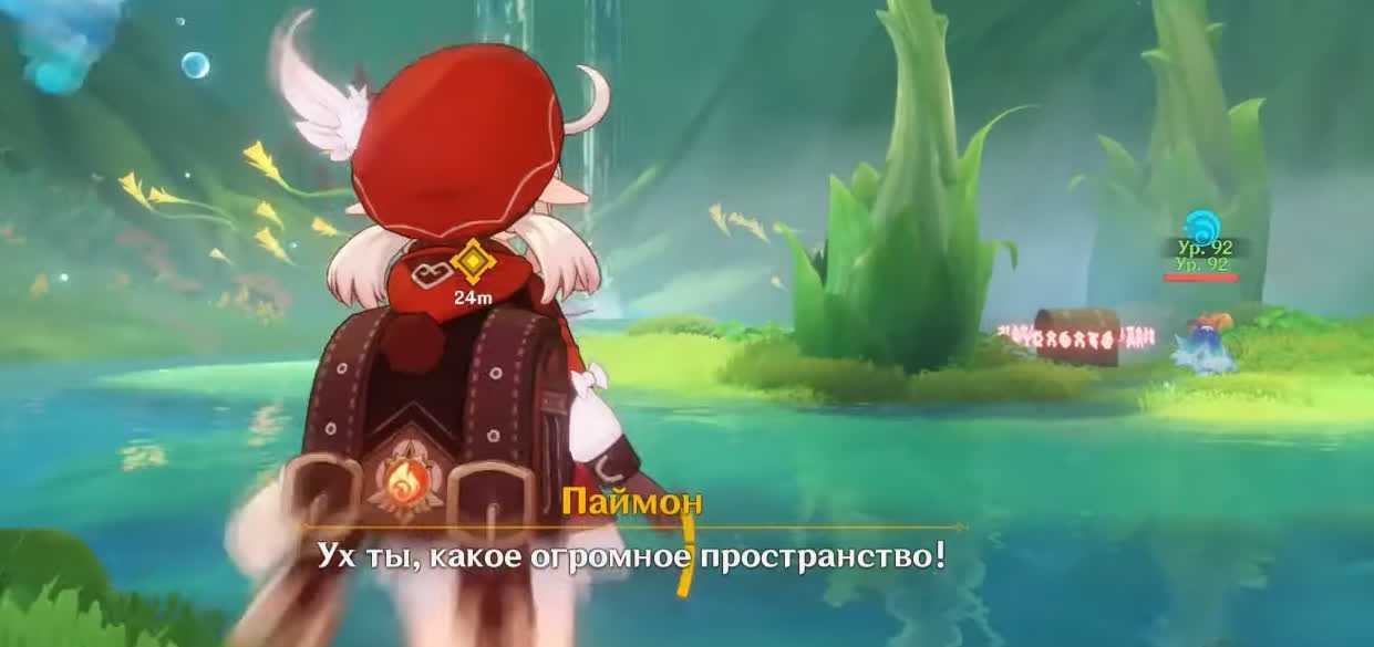 Затем еще один коридор с водой и колоннами, по которым нужно перебраться на другой берег, откуда стреляет парочка хиличурлов. Они медленные и в вас не попадут, если вы двигаетесь, а не стоите на месте.