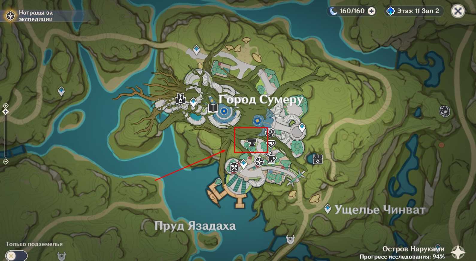 От моста возле телепорта идите на восток (маршрут показан на карте ниже). Войдите в пещеру и двигайтесь уже на юг. Окулус будет висеть над травой.