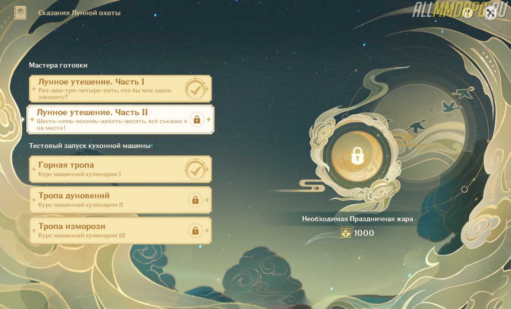 После выполнения задания «Раз-два-три-четыре-пять, что бы мне здесь заказать?» вам нужно приступить к квесту «Горная тропа». Он является первой частью «Курса машинной кулинарии». Задание можно получить в разделе «Сказания о лунной охоте» на баннере события.