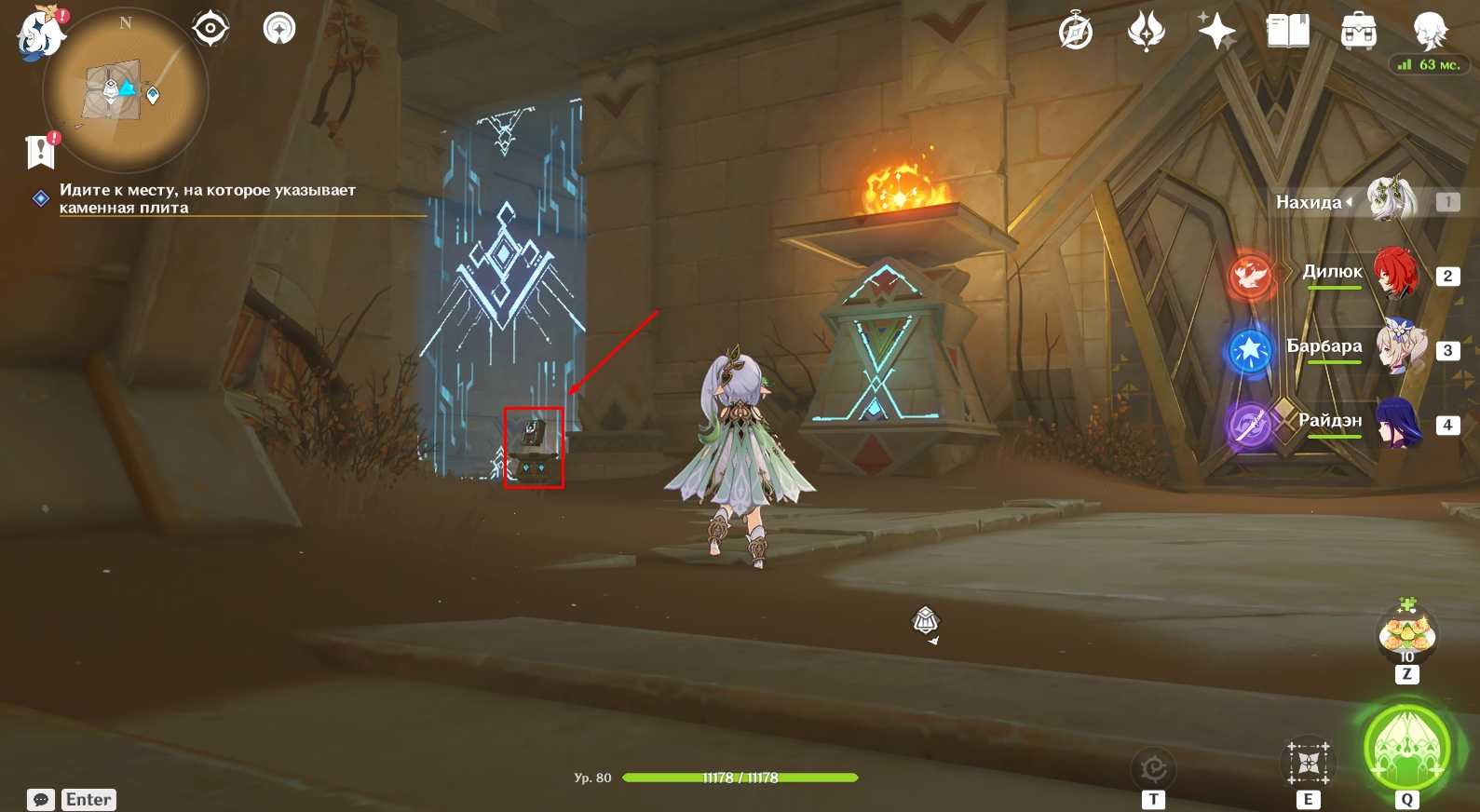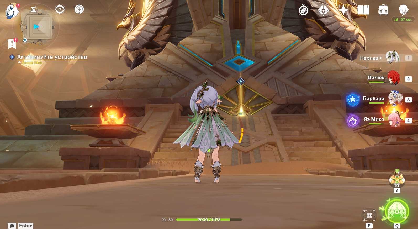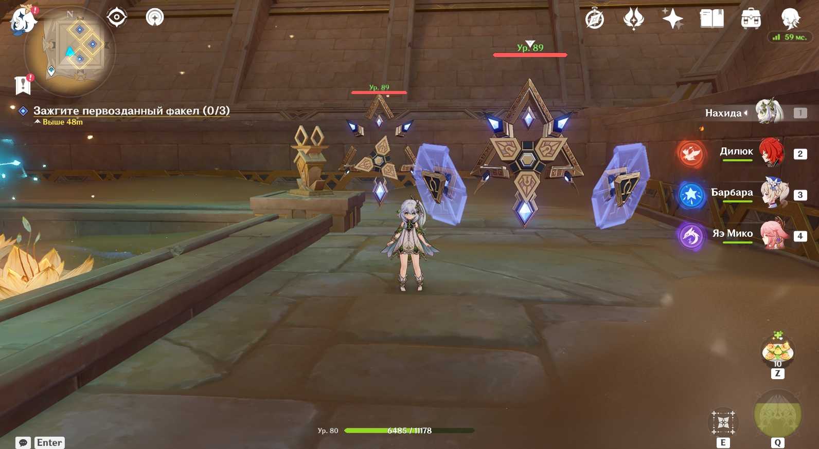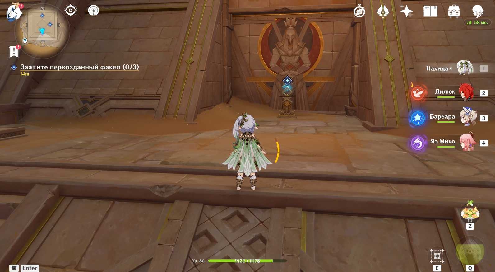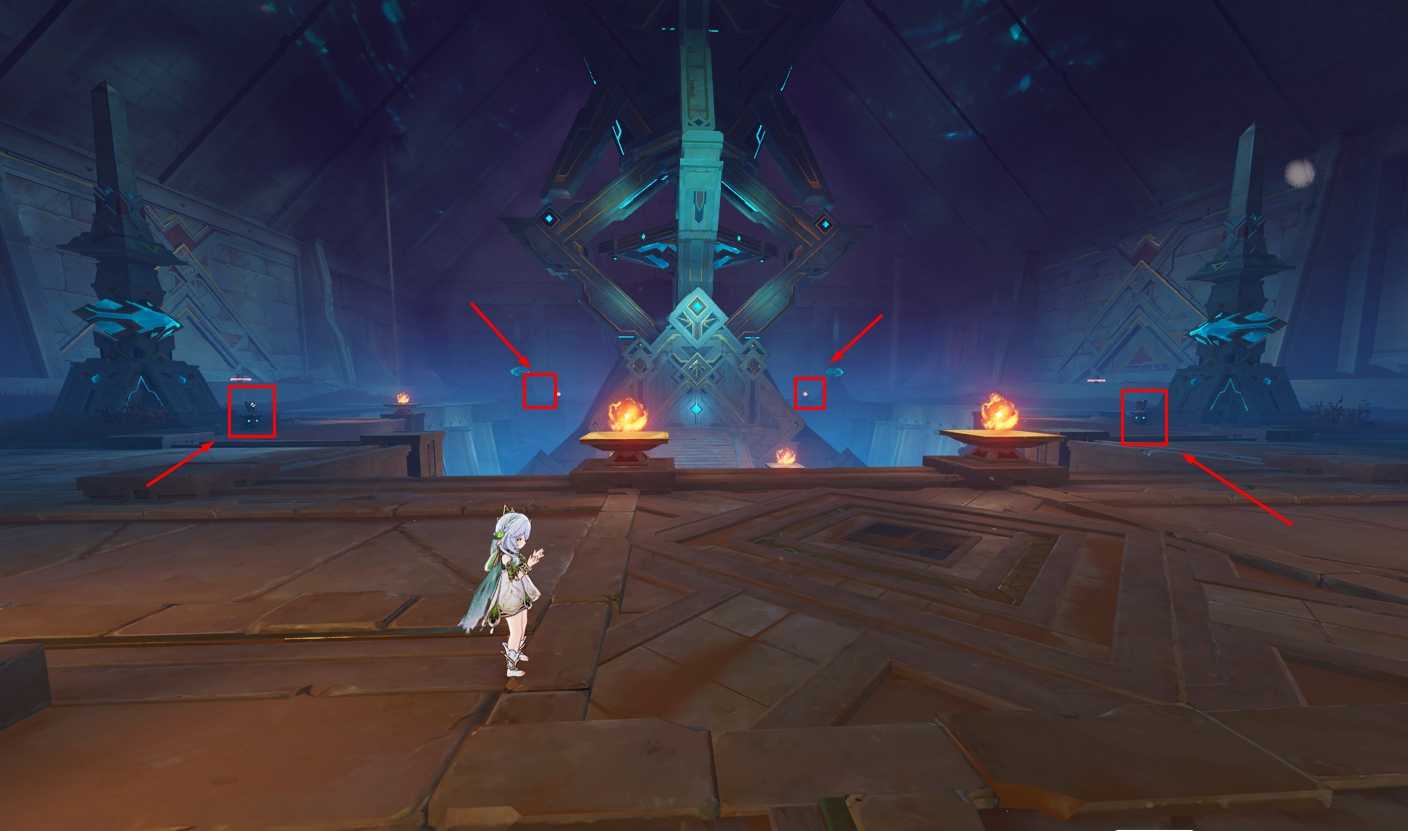 После вам нужно переключиться на героя стихии Пиро и поджечь 4 факела в комнате. Изначально они все находятся в призрачной форме, но когда вы возьмете бафф от устройства-клетки и подойдете к любому из них, он превратится в обычный. Факелы расположены по углам комнаты:
