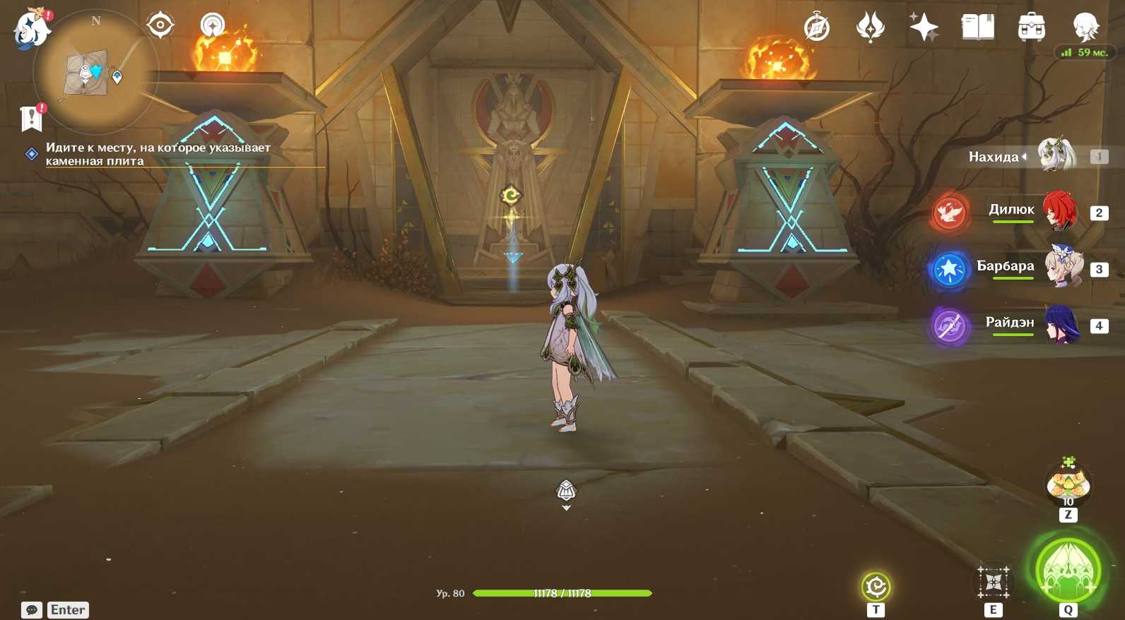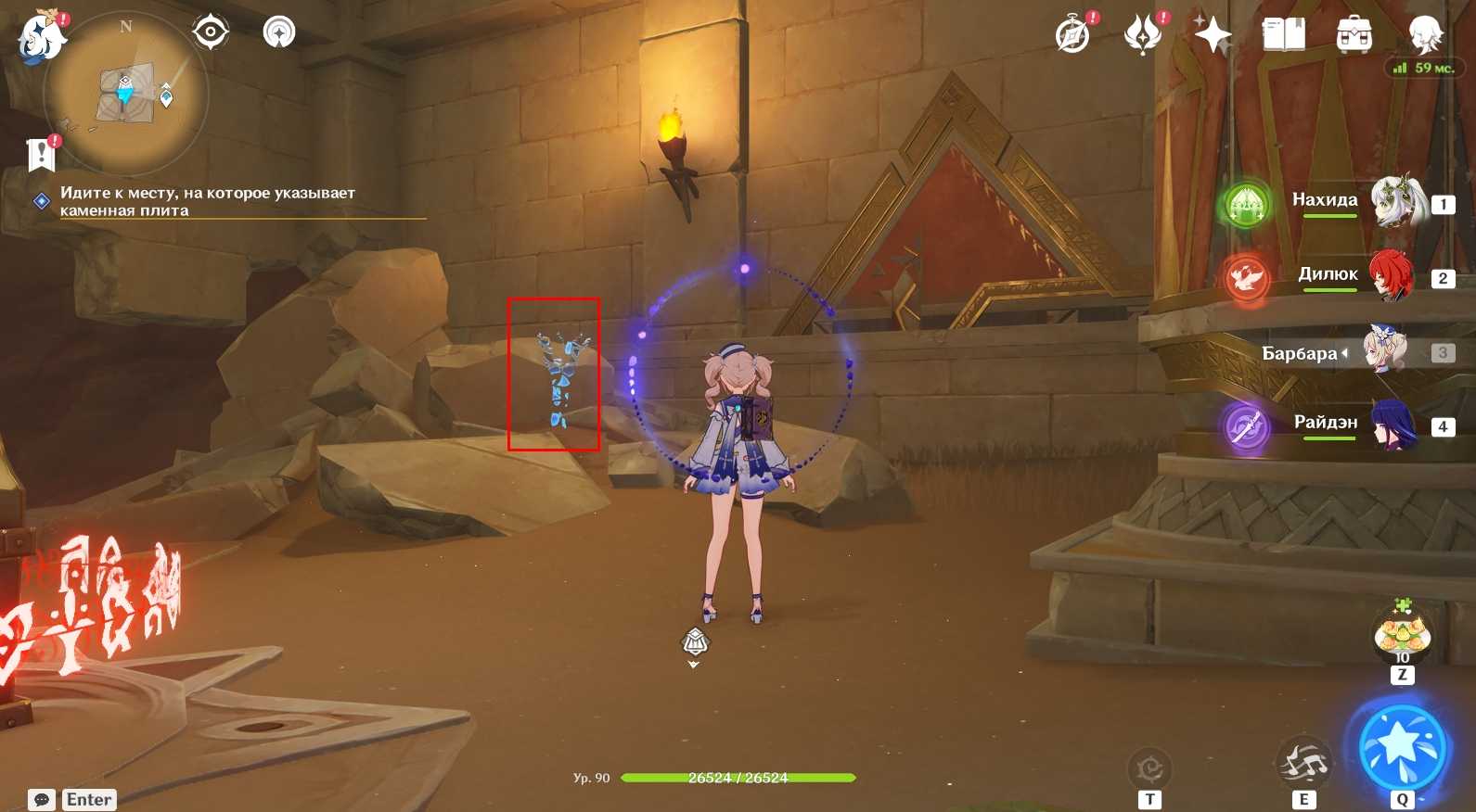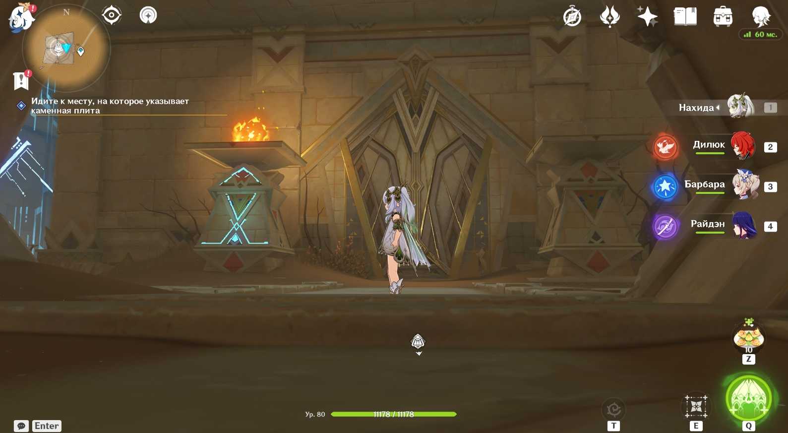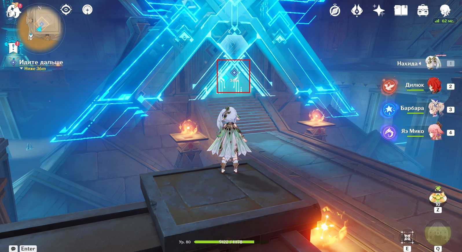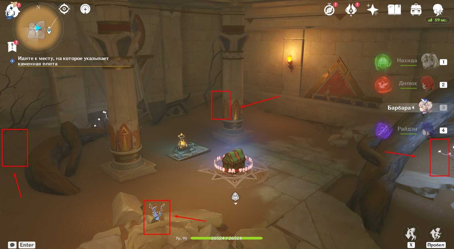 После вам нужно переключиться на героя стихии Пиро и поджечь 4 факела в комнате. Изначально они все находятся в призрачной форме, но когда вы возьмете бафф от устройства-клетки и подойдете к любому из них, он превратится в обычный. Факелы расположены по углам комнаты: