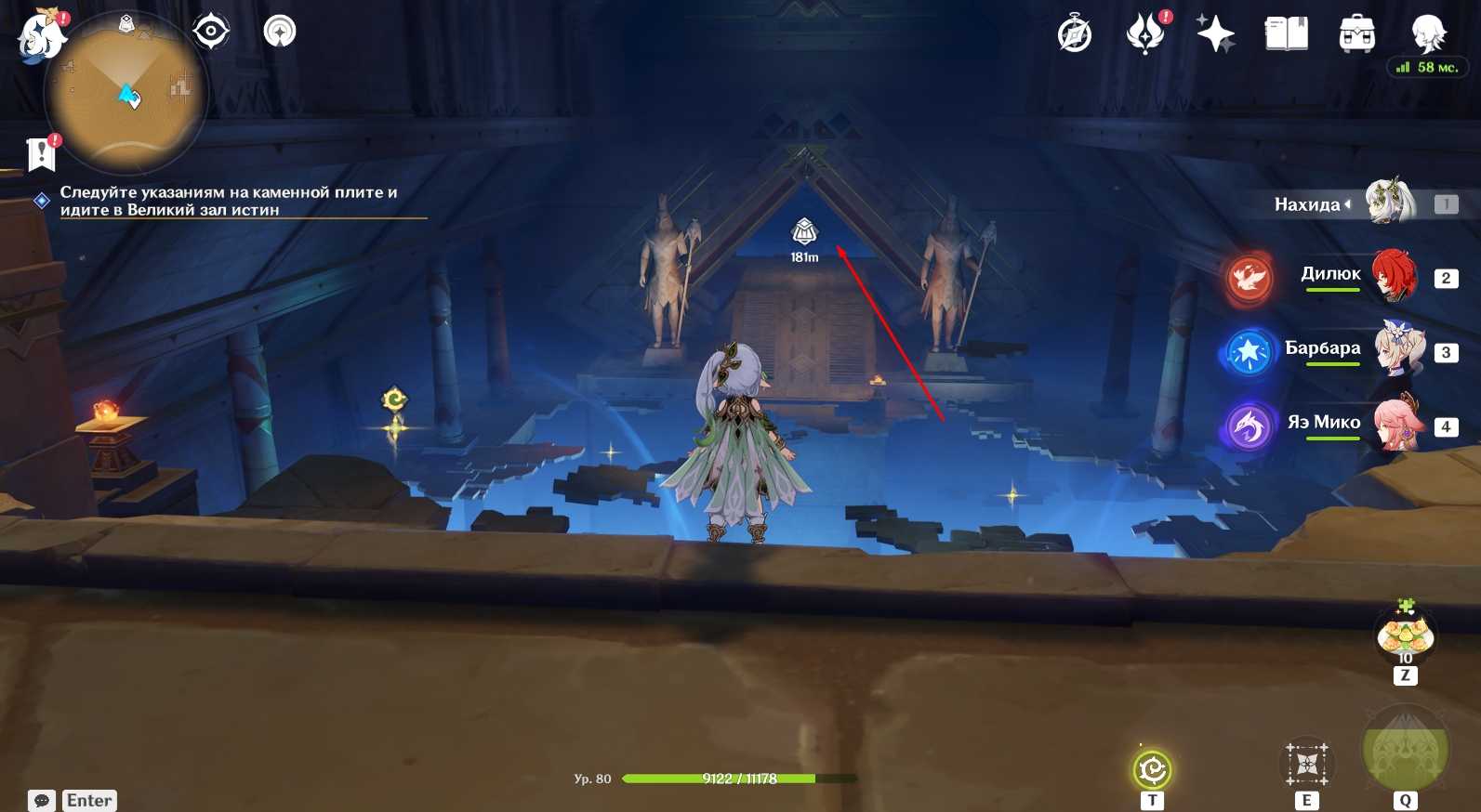 Используйте Плиту красных песков, перейдите на вкладку «Спуск в глубины», прокрутите список вниз и кликните по Великому залу истин, а потом выберите «Перейти», чтобы посмотреть местоположение этой локации на карте Пустыни. Используйте телепорт на юге от Гробницы царя Дешрета для возврата в Зал Дуат. Вам нужно перебраться через пропасть к противоположной стороне зала (к дверям между двумя статуями).
