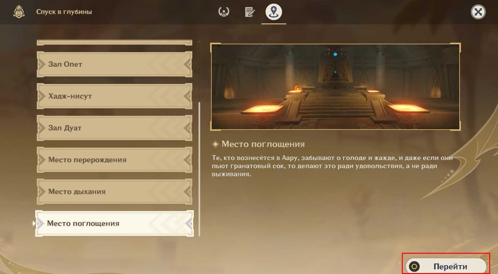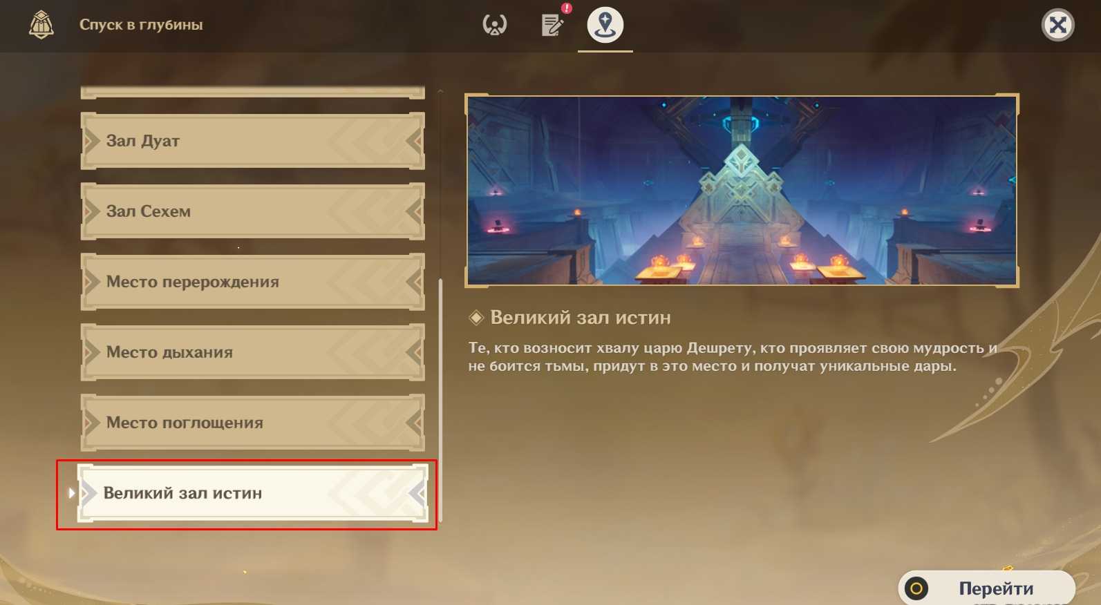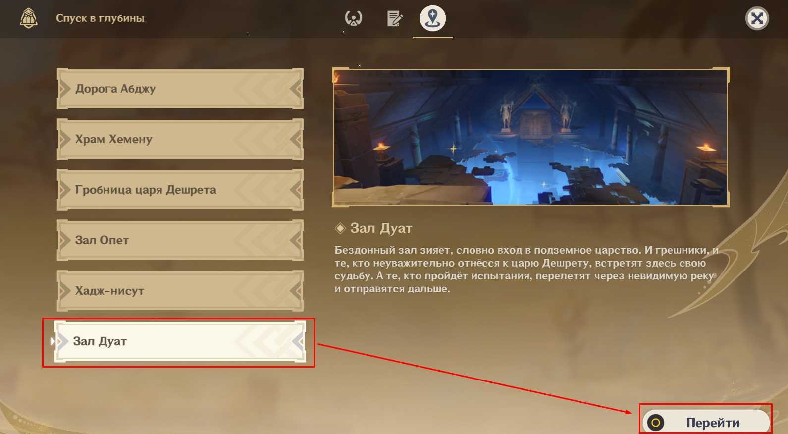 После этого не слишком позитивного разговора Паймон предложит посмотреть на Плиту красных песков. На ней появился новый символ и это значит, что мы можем отправиться исследовать новые области. На этом моменте на Плите красных песков загорятся 2 символа – Власть иерофании и Власть переправы. Откройте интерфейс инструмента (лежит в инвентаре на вкладке с квестовыми предметами), чтобы получить больше информации. Вы увидите, что в списке мест, куда можно попасть с помощью плиты, появилась новая локация – Зал Дуат. Выберите ее и нажмите на кнопку «Перейти». После этого вы увидите метку у телепорта рядом с Дюной Магмы. Отправляйтесь туда.