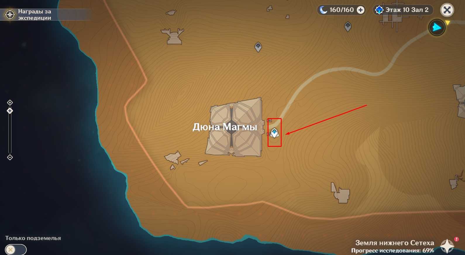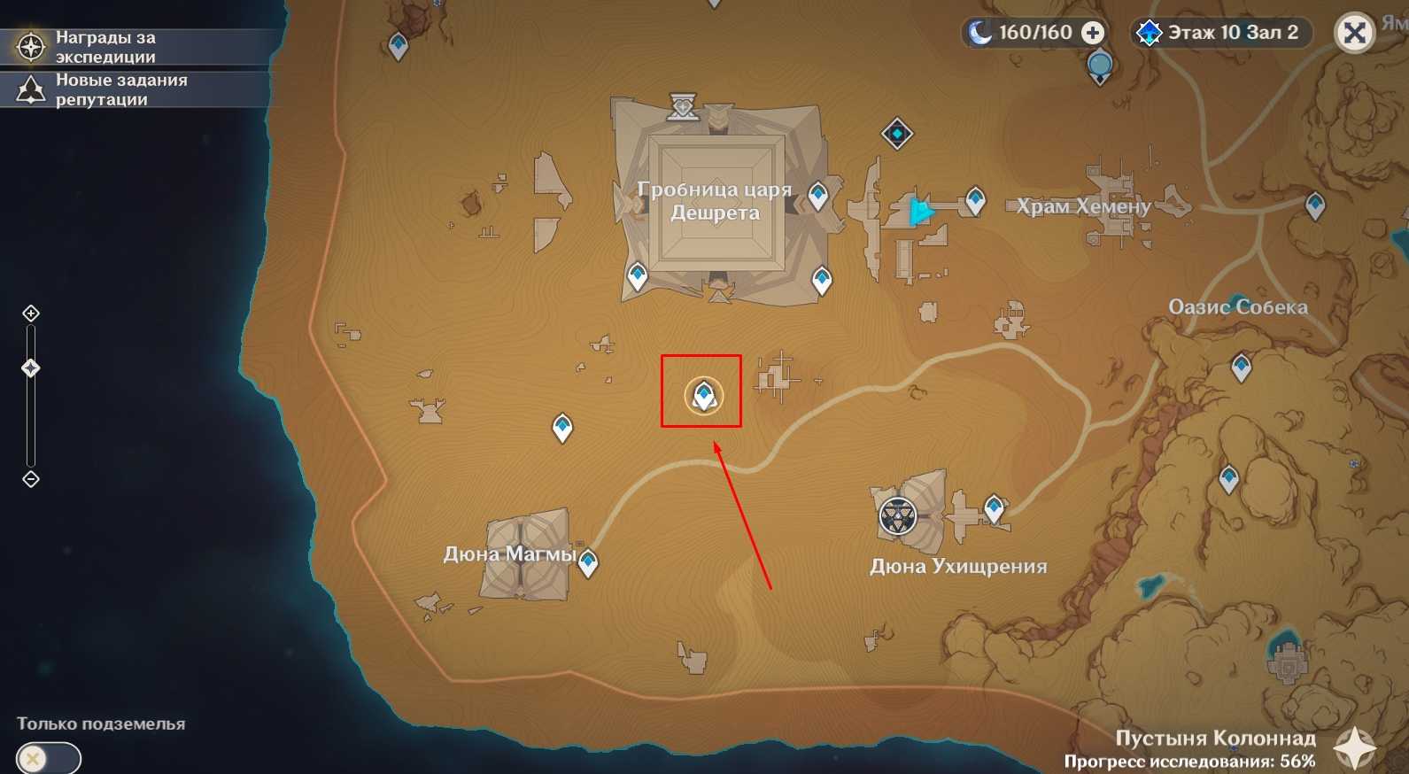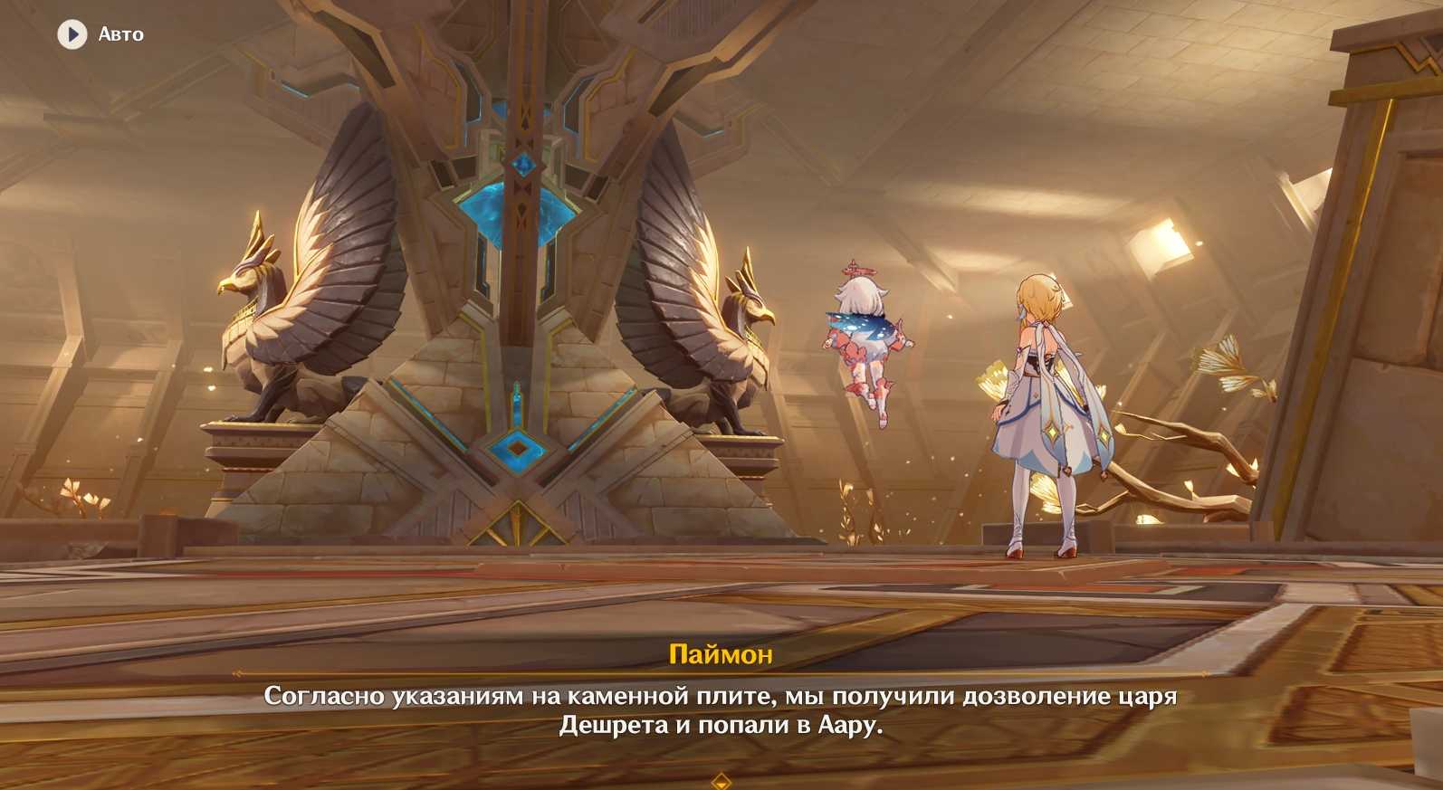 После этого не слишком позитивного разговора Паймон предложит посмотреть на Плиту красных песков. На ней появился новый символ и это значит, что мы можем отправиться исследовать новые области. На этом моменте на Плите красных песков загорятся 2 символа – Власть иерофании и Власть переправы. Откройте интерфейс инструмента (лежит в инвентаре на вкладке с квестовыми предметами), чтобы получить больше информации. Вы увидите, что в списке мест, куда можно попасть с помощью плиты, появилась новая локация – Зал Дуат. Выберите ее и нажмите на кнопку «Перейти». После этого вы увидите метку у телепорта рядом с Дюной Магмы. Отправляйтесь туда.