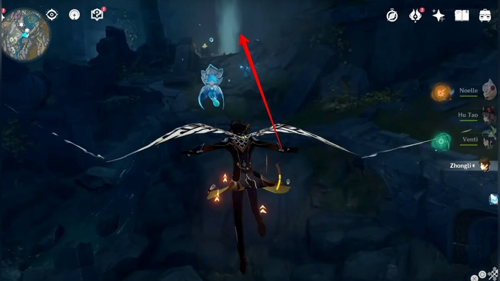 Следующая строчка находится рядом с предыдущей. Вы можете воспользоваться тем же телепортом, но вам нужно лететь немного левее водопада. Доберитесь до противоположной стороны и спрыгивайте вниз. Светящаяся строчка находится там.