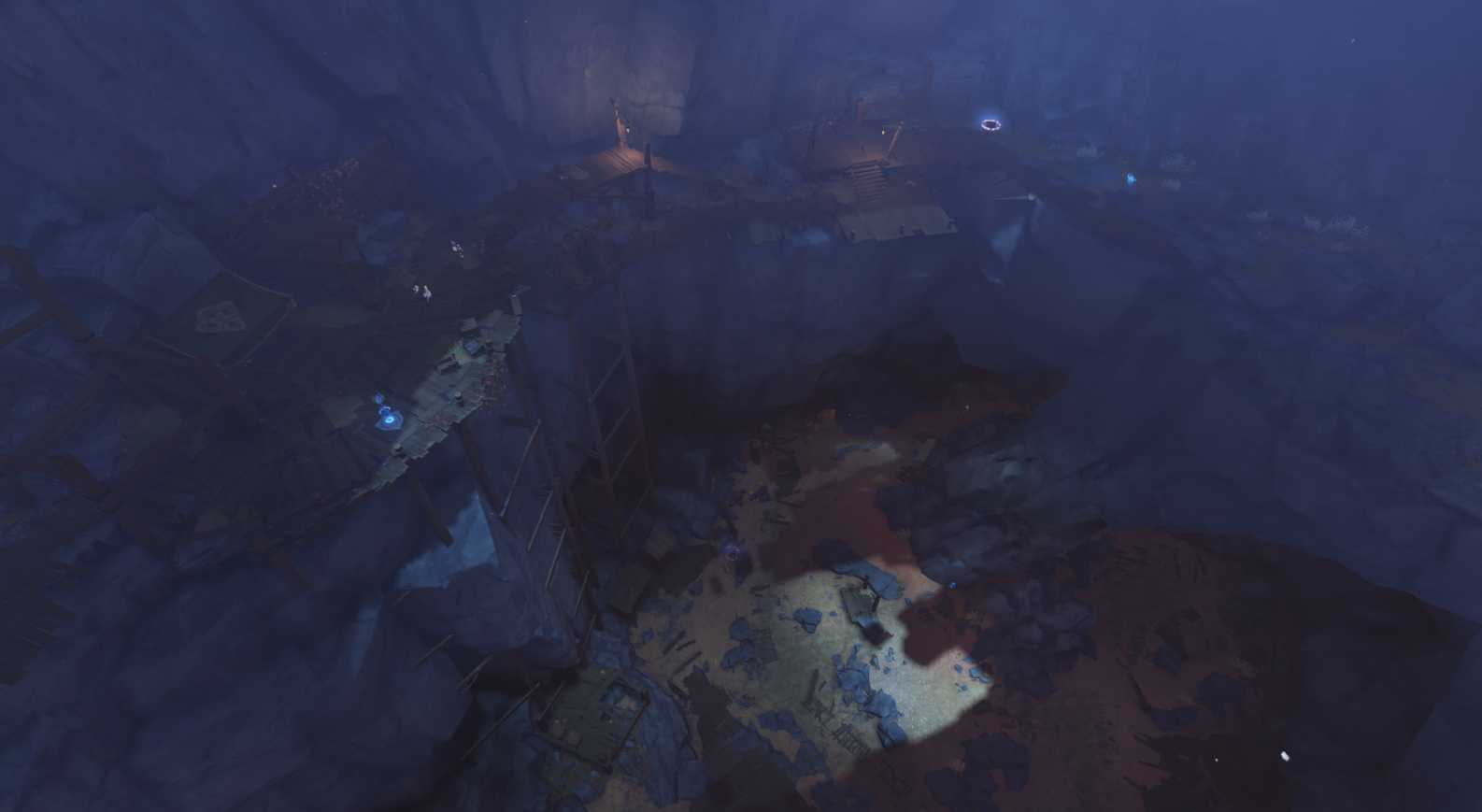 - Идем к подъемнику, забираемся наверх к телепорту, после чего двигаемся по лестнице к мосту. Оттуда попадаем в пещеру и фотографируем минерал.