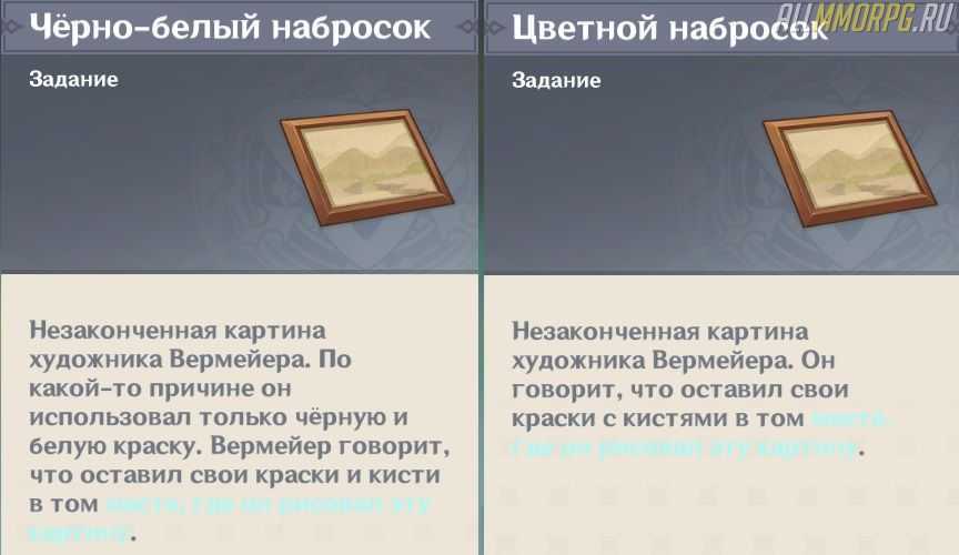 Чтобы взять квест, подойдите к Вермееру и нажмите клавишу F. Мужчина расскажет вам свою историю и в конце попросит помощи: ему нужны инструменты для рисования – кисть и краски, потерянные им во время путешествия. В качестве подсказки, где искать предметы, он даст игроку два изображения – цветное и черно-белое.