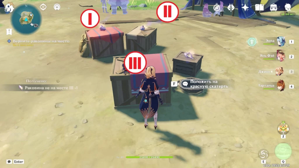 Возвратитесь в лагерь Фатуи на центральном острове и подойдите к коробкам. Вам нужно будет правильно расставить раковины: