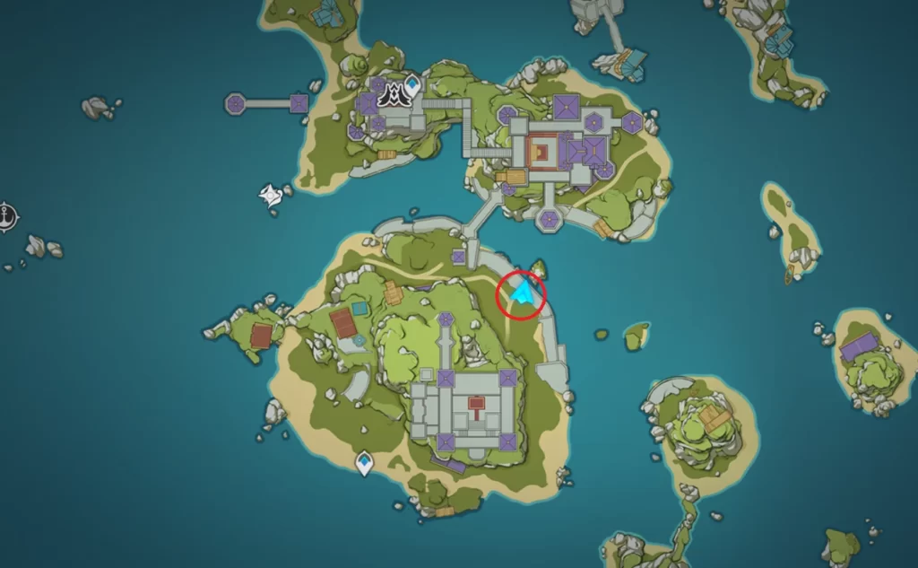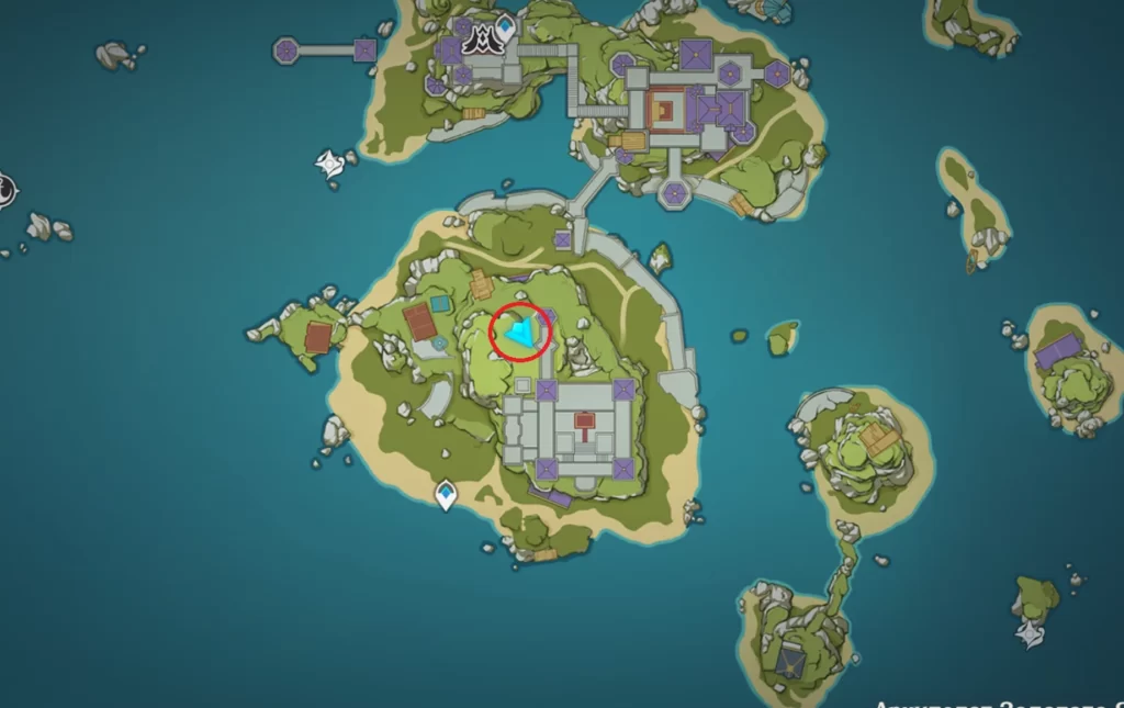 Отправляйтесь в отмеченную на карте ниже локацию. Мы подробно объяснили, как попасть сюда в квесте «Гидрологическое исследование разлома». Тут вы обнаружите заблокированный сундук и четыре Гео монумента, которые вам нужно будет активировать.