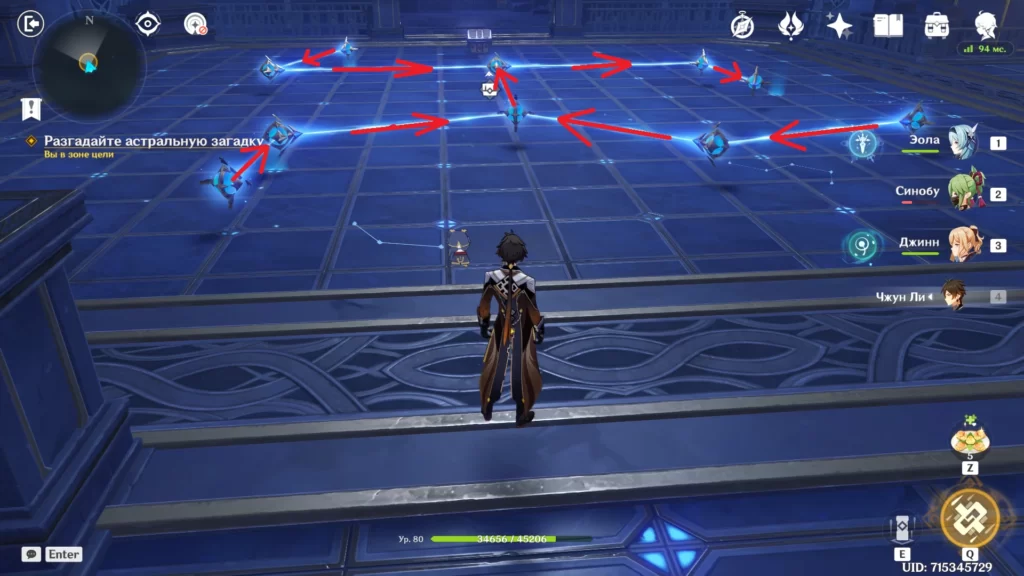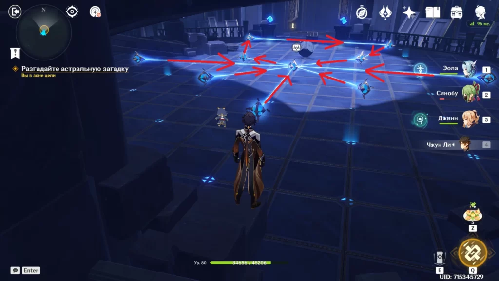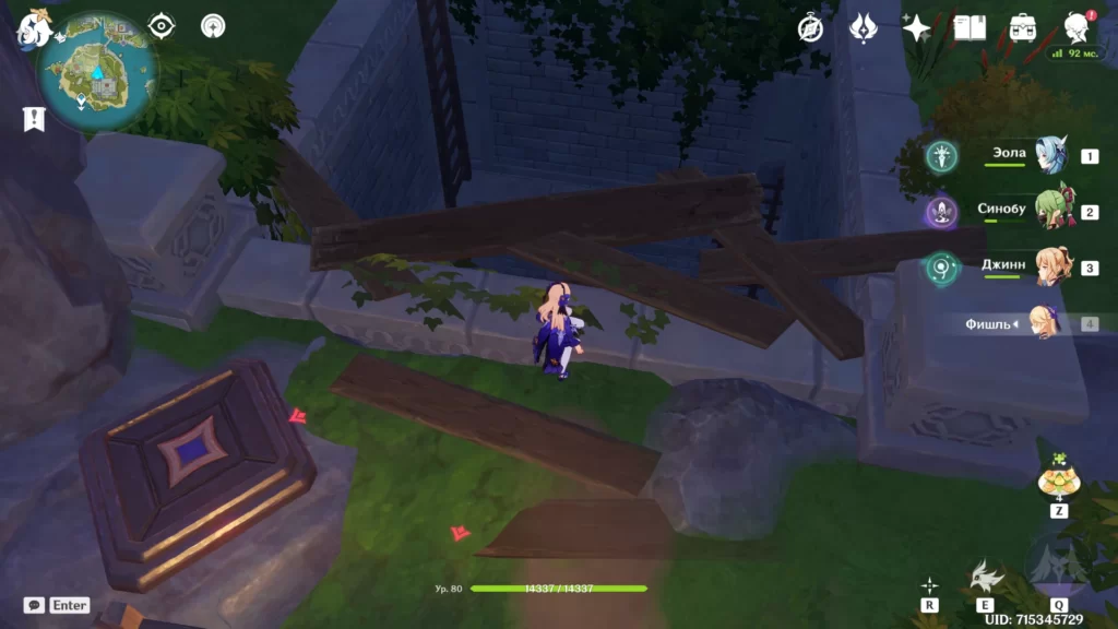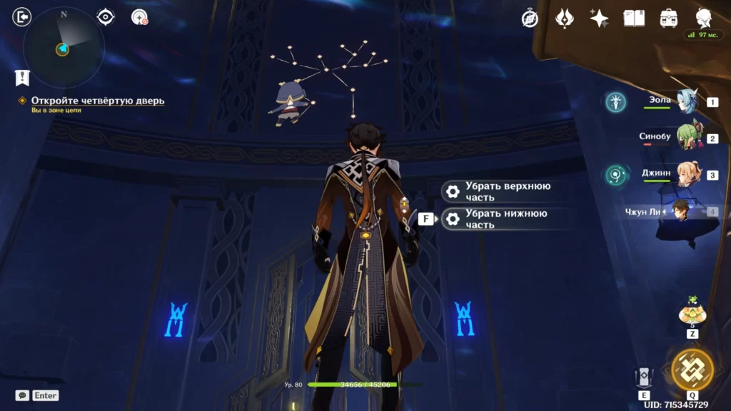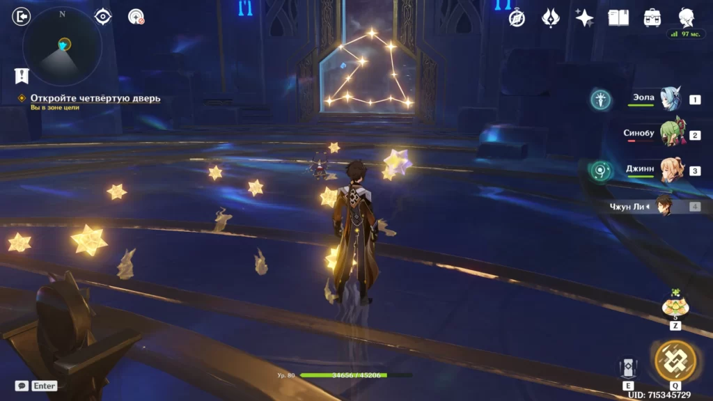 | 2 | Спрыгните с выступа к головоломке со стихийными тотемами и активируйте их в таком порядке – Крио, Анемо, Пиро и Гидро. Для этого вам нужны герои соответствующих элементов. Пример: